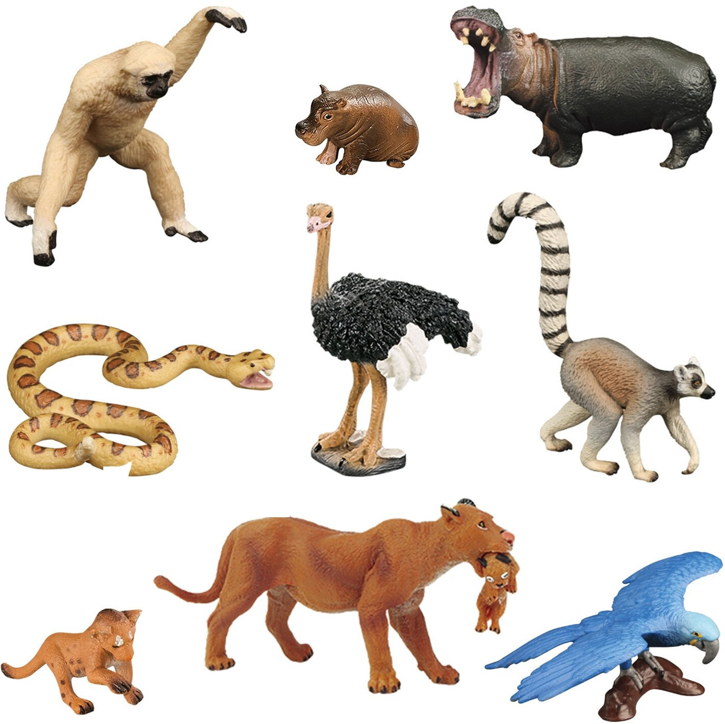 Серия: Мир диких животных В игровом наборе «Дикие животные» — фигурки двух львов, змеи, лемура, попугая, обезьяны, страуса, двух бегемотов являются уменьшенными копиями реальных животных. Они максимально похожи на настоящих животных. Такие фигурки приятно дарить и получать в подарок. |