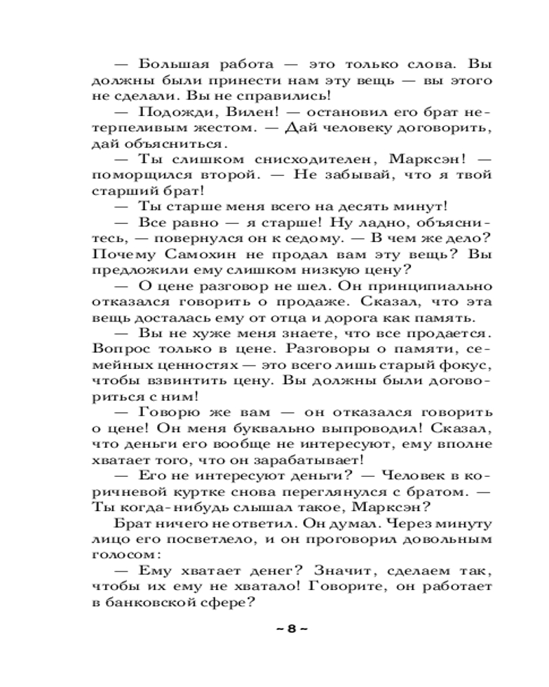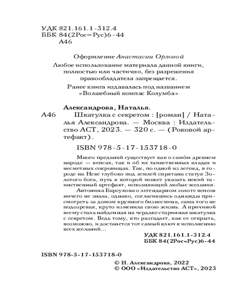 Шкатулка с секретомНаталья Николаевна Александрова В данный момент этот товар отсутствует в продаже. Возможно, у нас найдется аналогичный или похожий товар здесь. Серия: Роковой артефакт (м) Много преданий существует как о само́м древнем народе — вепсах, так и об их таинственных кладах и несметных сокровищах. Так, по одной из легенд, в городе на Неве глубоко под землей спрятана статуя Золотого бога, путь к которой может указать некий таинственный артефакт, исполняющий любые желания. |
