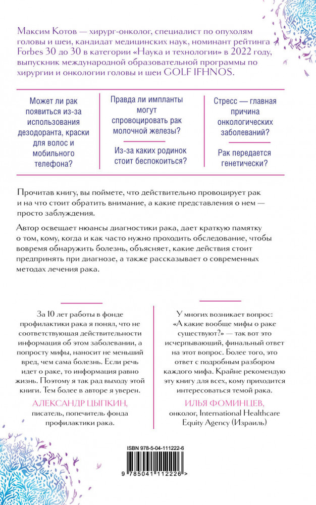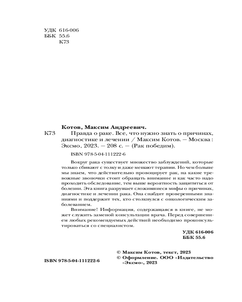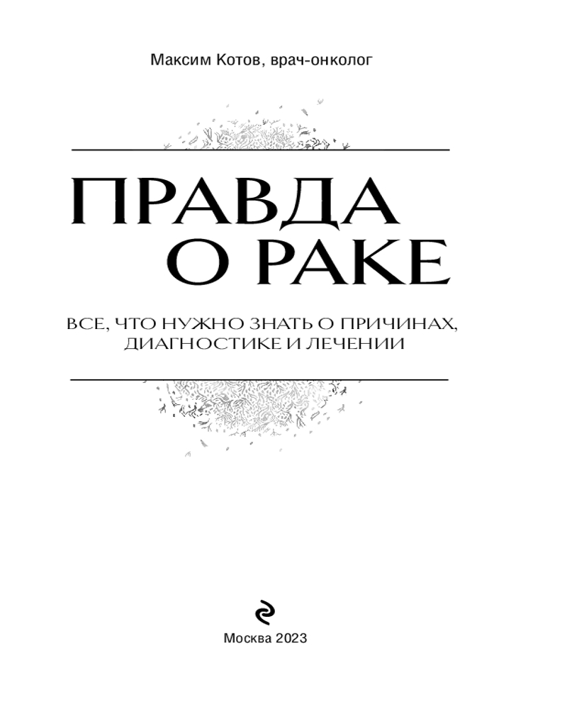 Правда о раке. Всё, что нужно знать о причинах, диагностике и леченииВ данный момент этот товар отсутствует в продаже. Возможно, у нас найдется аналогичный или похожий товар здесь. Серия: Рак победим Максим Котов — врач-онколог, хирург, кандидат медицинских наук, лауреат премий Корейского общества медицинской онкологии и Японского общества медицинской онкологии среди молодых исследователей. Стажировался в ведущих клиниках мира по лечению опухолей шеи и головы (Memorial Sloan Kettering Cancer Center и MD Anderson Cancer Center). |