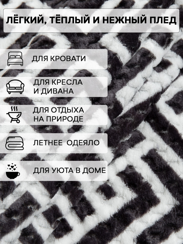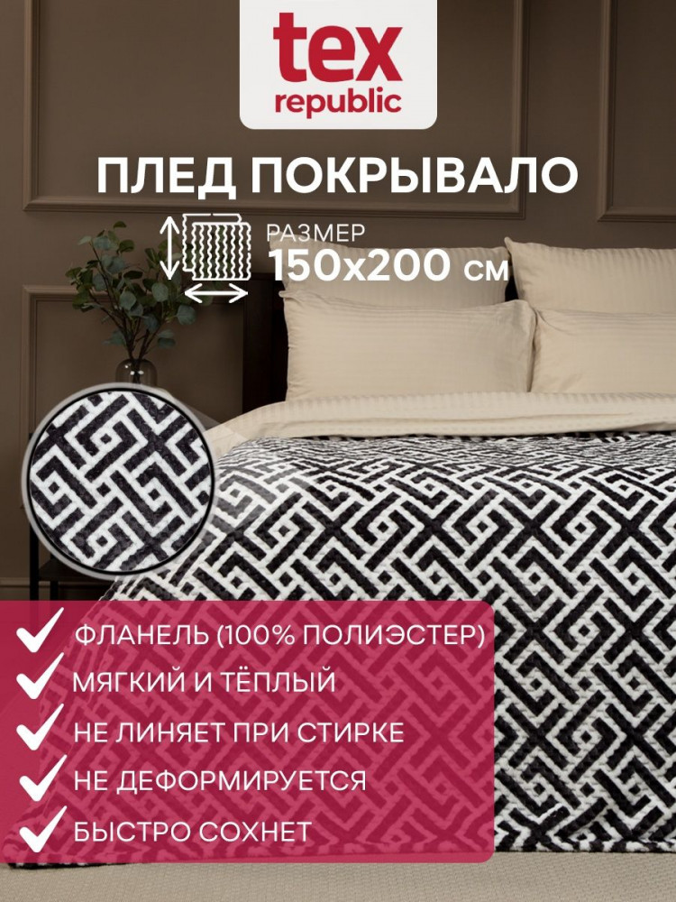 Пледы из фланели торговой марки TexRepublic — отличаются принципиально новым качеством ворса, обладающего исключительной мягкостью и шелковистостью! Яркие, легкие и необыкновенно мягкие. Разнообразие расцветок дает возможность добавить индивидуальности любому интерьеру. Ткань выполнена из 100% полиэстера по новейшей технологии. Процесс расщепления волокна и дополнительные расчесывания делают эти пледы особенно воздушными и сохраняют опрятный внешний вид изделия в течение долгого времени. Отличительной особенностью пледов серии Deco Lux является их яркая цветовая гамма с печатным геометрическим рисунком. Изделия из этой серии легкие, мягкие, теплые, с низким ворсом. Идеально подходят для межсезонья.