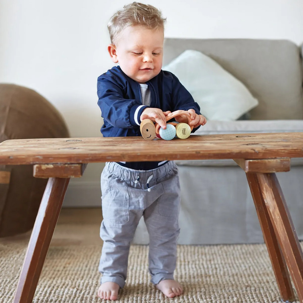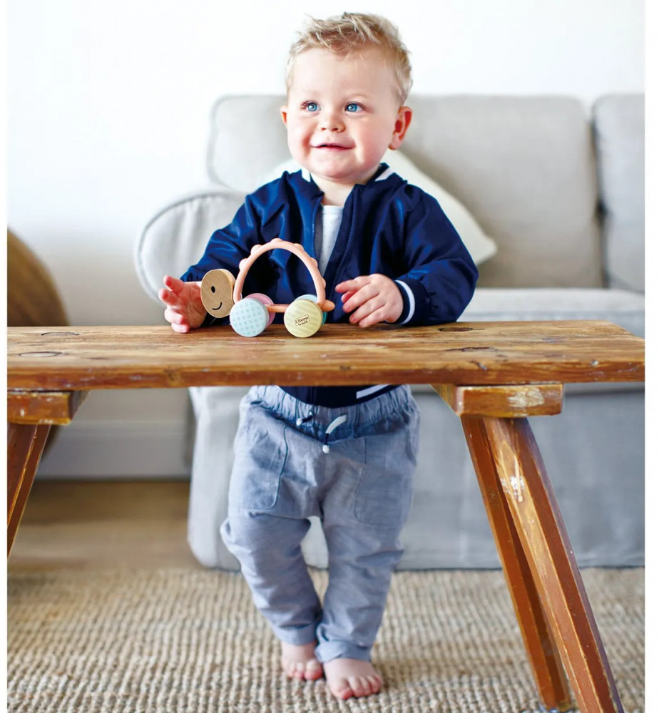Качественно выполнено, дерево хорошо обработано. Ребёнку 5 месяцев, катать еще не получается, но с удовольствием крутит колеса, подтягивает и отталкивает игрушку, надевает на руку, как сумку.