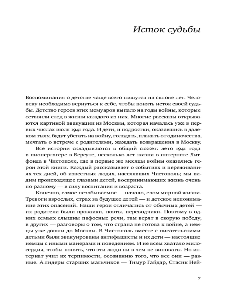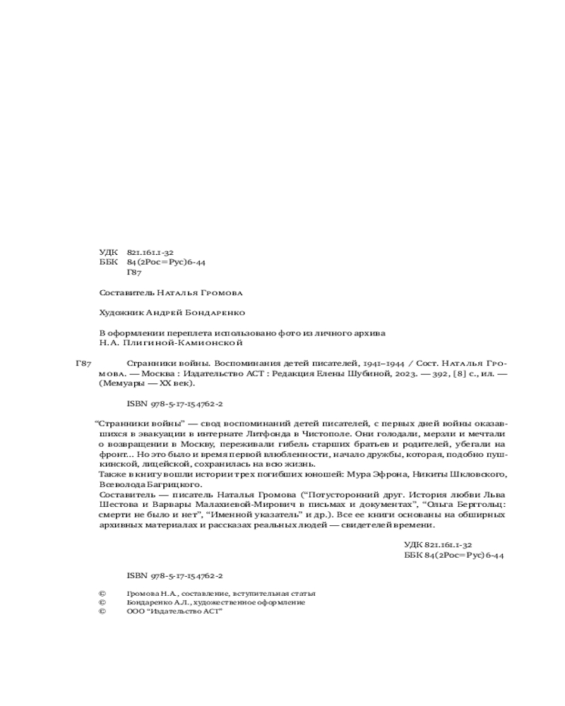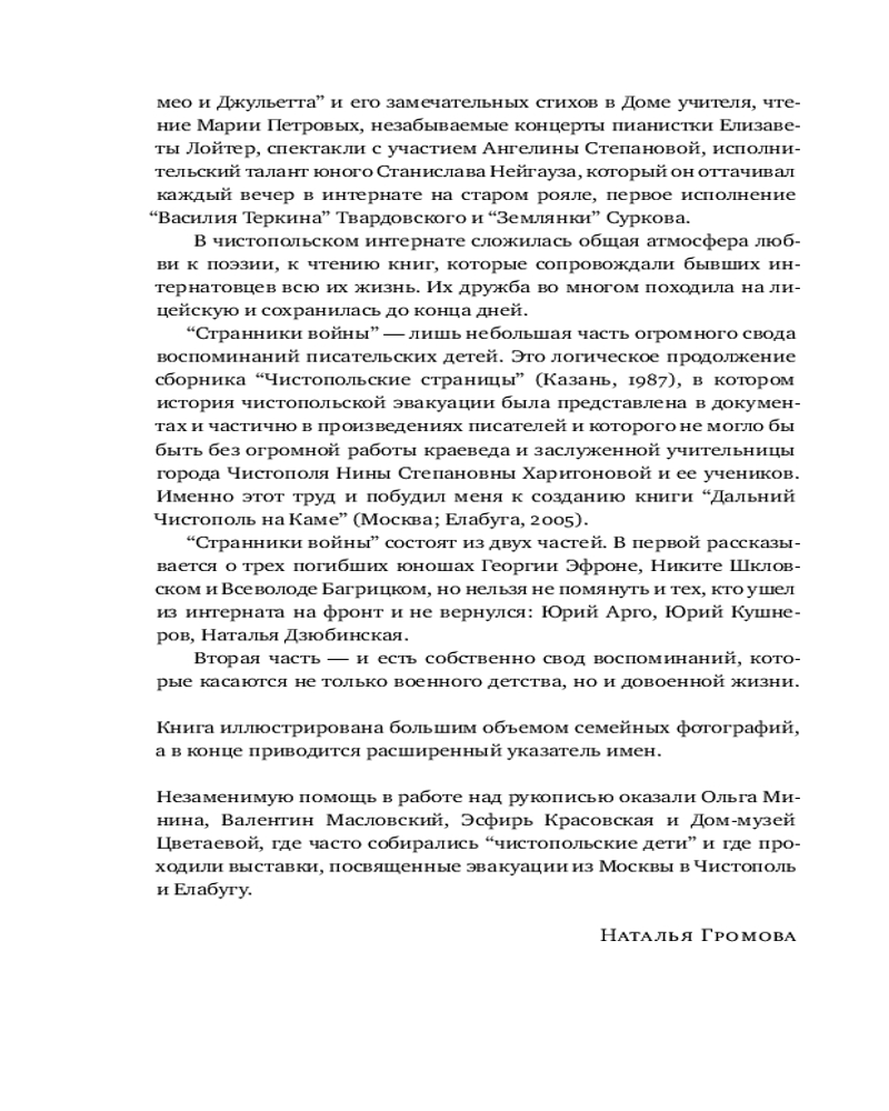 Серия: Мемуары - XX век «Странники войны» — свод воспоминаний детей писателей, с первых дней войны оказавшихся в эвакуации в интернате Литфонда в Чистополе. Они голодали, мерзли и мечтали о возвращении в Москву, переживали гибель старших братьев и родителей, убегали на фронт... Но это было и время первой влюбленности, начало дружбы, которая, подобно пушкинской, лицейской, сохранилась на всю жизнь. Также в книгу вошли истории трех погибших юношей: Мура Эфрона, Никиты Шкловского, Всеволода Багрицкого. |