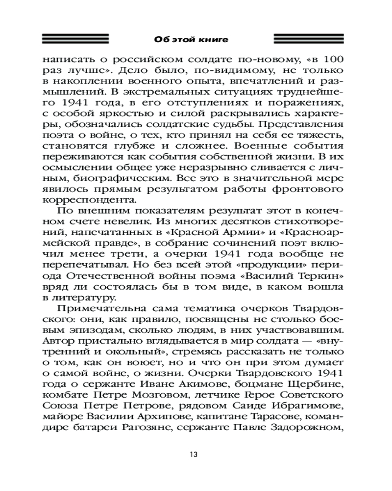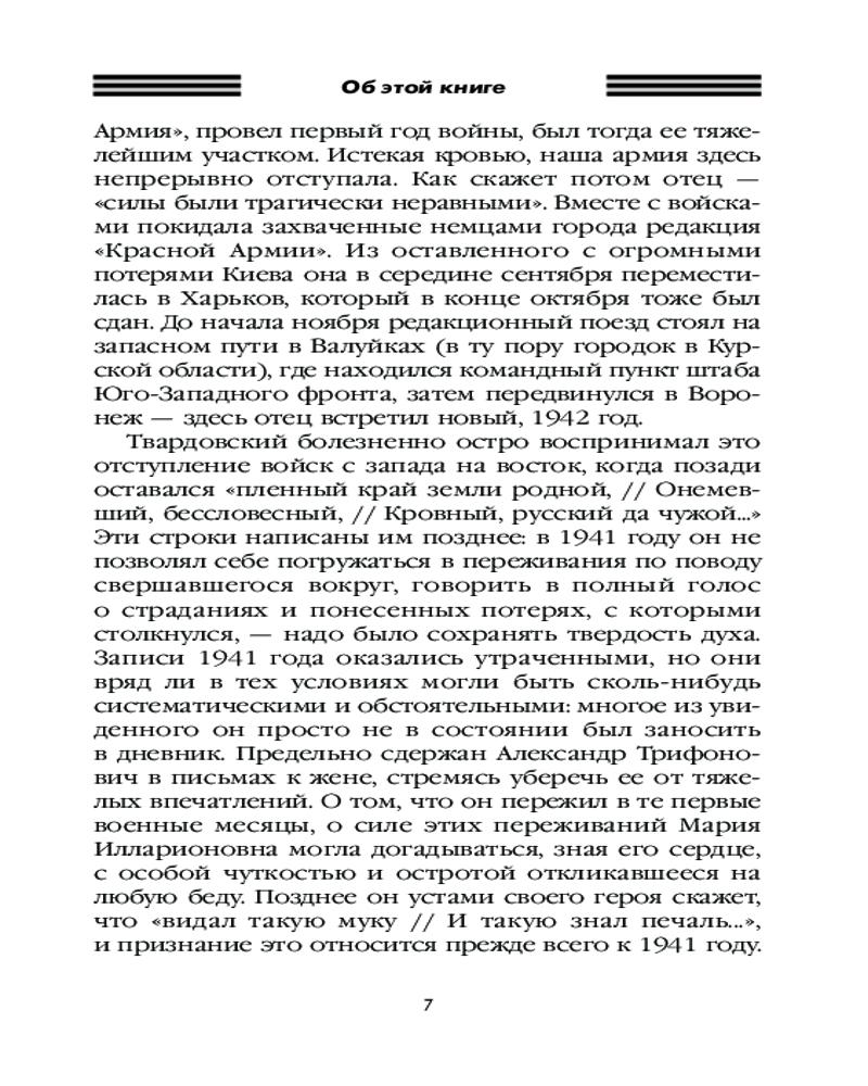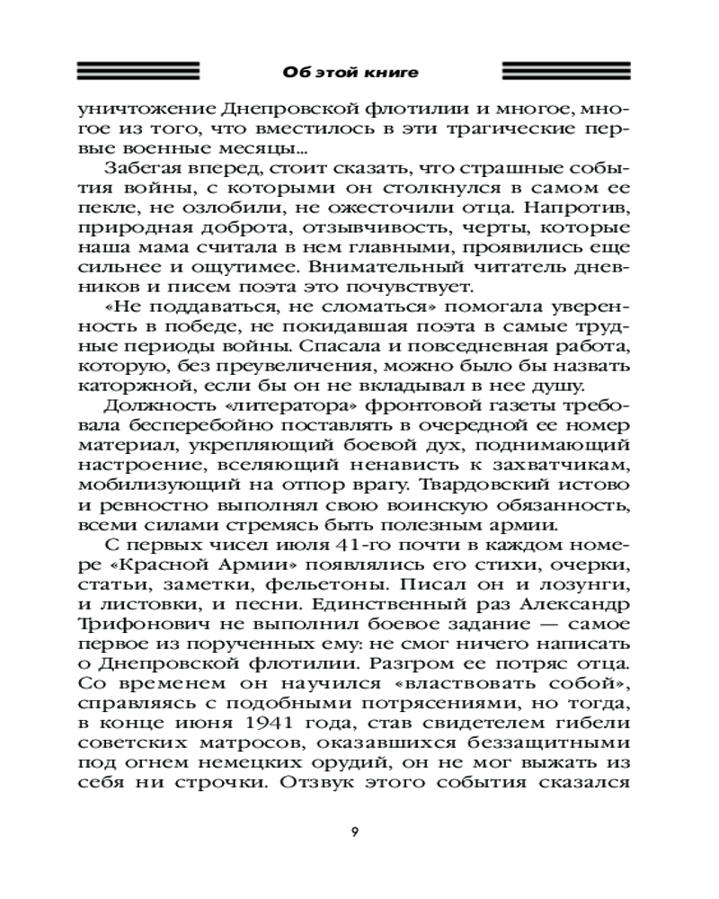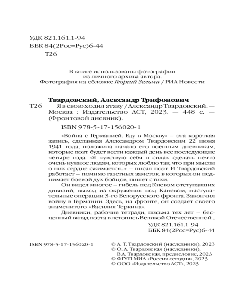 Я в свою ходил атаку...Александр Трифонович Твардовский В данный момент этот товар отсутствует в продаже. Возможно, у нас найдется аналогичный или похожий товар здесь. Серия: Фронтовой дневник (новое оформление) «Война с Германией. Еду в Москву» — эта короткая запись, сделанная Александром Твардовским 22 июня 1941 года, положила начало его военным дневникам, которые поэт будет вести каждый день все последующие четыре года. «Я чувствую себя в силах сделать нечто очень нужное людям, которых люблю так, что при мысли о них сердце сжимается...» — писал поэт. И Твардовский работает — помимо газетных заметок, в которых он поднимает боевой дух бойцов, пишет стихи. Он видел многое — гибель под Киевом отступавших дивизий, выход из окружения под Каневом, наступательные операции 3-го Белорусского фронта. Закончил войну в Германии. Здесь, на фронте, он создает своего знаменитого «Василия Теркина». Дневники, рабочие тетради, письма тех лет — бесценный вклад поэта в летопись Великой Отечественной... |
