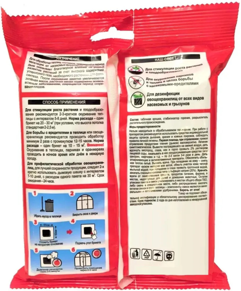Рекомендации по применению: хранить вдали от открытых источников огня и нагревательных приборов, в местах недоступных для детей. Производить розжиг шашки на открытом воздухе вдали от легковоспламеняющихся предметов и жидкостей. Обработку помещений производят при отсутствии в них живых растений, плодовоовощной продукции, животных и людей. Следует пользоваться ИСЗ (респираторы, очки). В случае попадания дыма в глаза, промыть их большим количеством воды, так как сернистый газ вызывает раздражение слизистой. Золу от сгоревшей шашки залить водой. Утилизировать упаковку после использования шашки вместе с бытовыми отходами. |