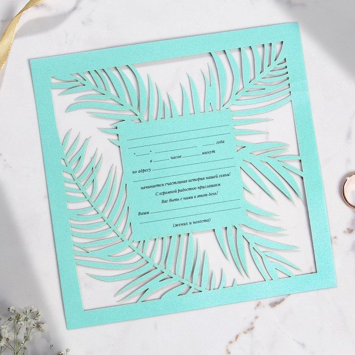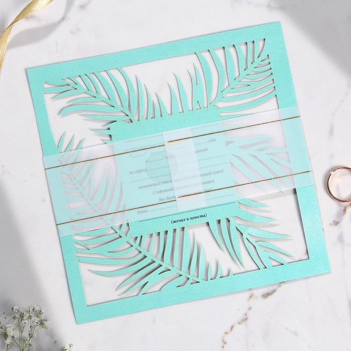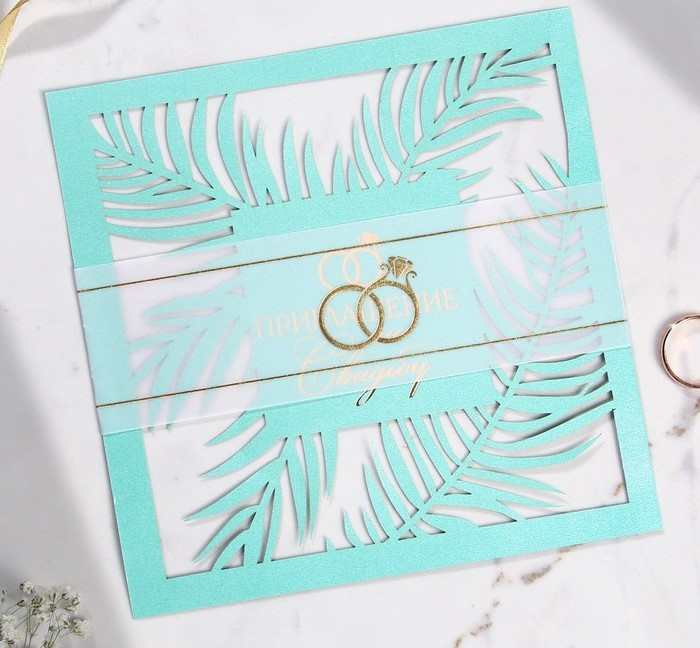 Изделие выполнено из бумаги плотностью 300 г/м², дополнено обечайкой из кальки и тиснением. Это придаёт дорогой и роскошный вид. Текст приглашения содержит свободные поля для имени адресата, времени, даты и адреса проведения мероприятия. Это потрясающее приглашение достойно стать частью такого важного события в жизни, как свадьба!