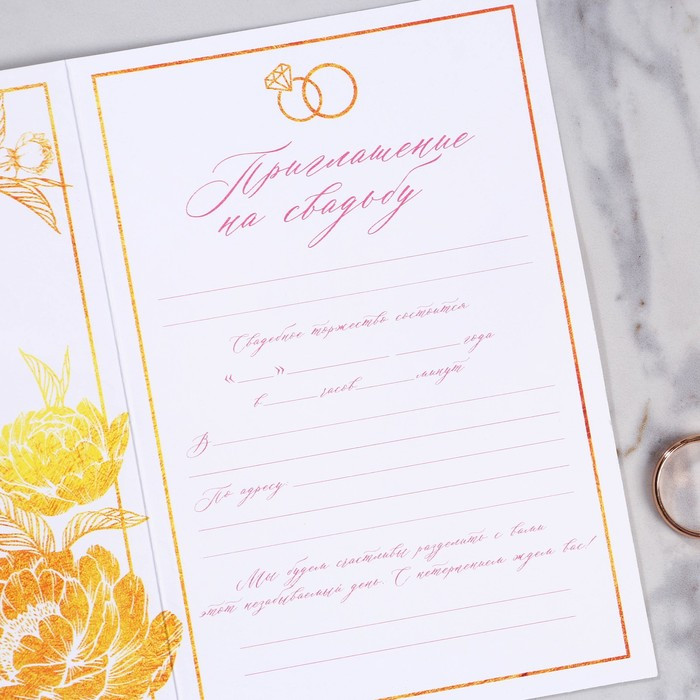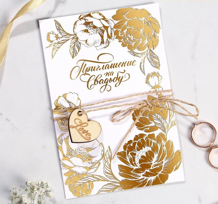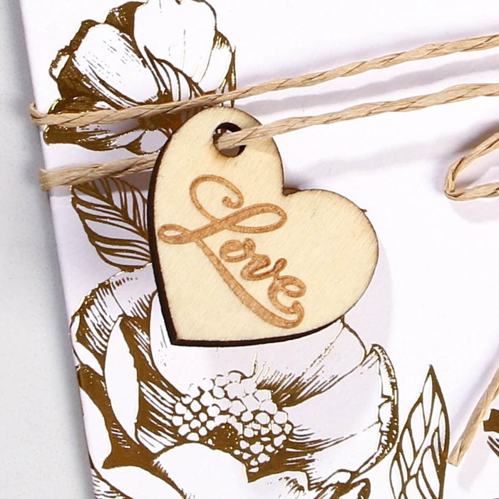 Изделие выполнено из бумаги плотностью 300 г/м² и дополнено деревянным украшением в виде сердца. Это придаёт дорогой и роскошный вид. Текст приглашения содержит свободные поля для имени адресата, времени, даты и адреса проведения мероприятия. Это потрясающее приглашение достойно стать частью такого важного события в жизни, как свадьба!