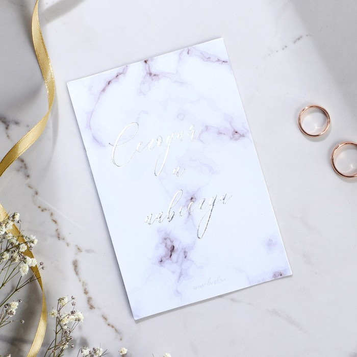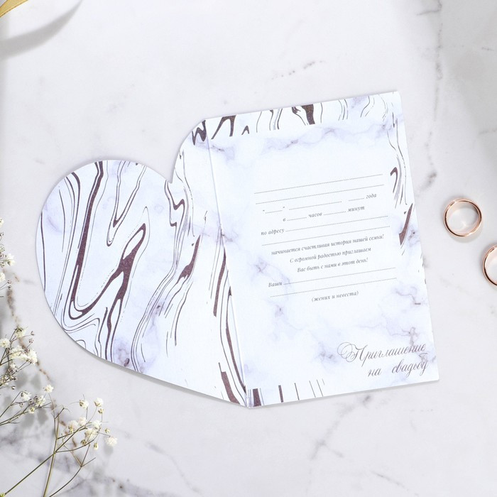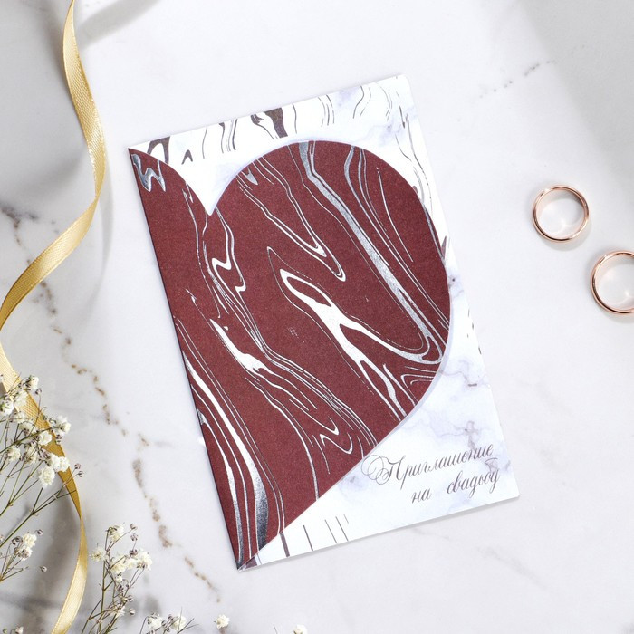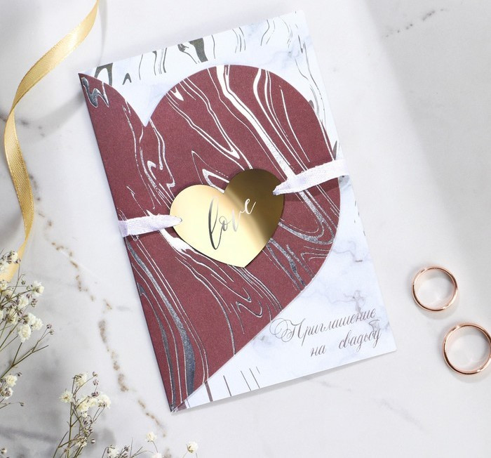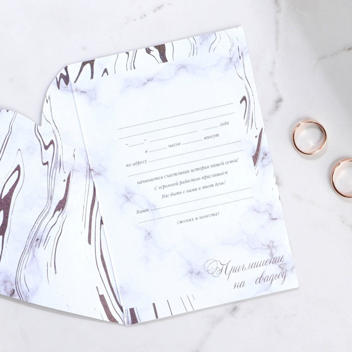 Изделие выполнено из бумаги плотностью 300 г/м² и дополнено декоративным элементом и тиснением. Это придаёт дорогой и роскошный вид. Текст приглашения содержит свободные поля для имени адресата, времени, даты и адреса проведения мероприятия. Это потрясающее приглашение достойно стать частью такого важного события в жизни, как свадьба!