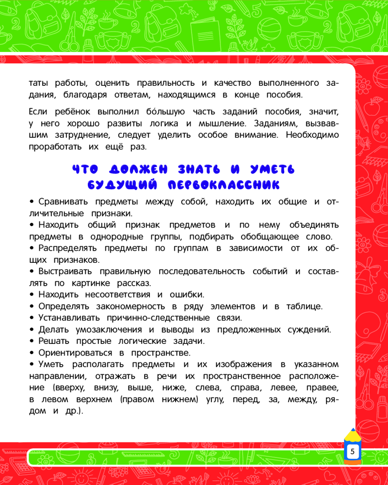 Серия: Лето перед школой. Большая рабочая тетрадь будущего первоклассника Данный тренажёр для подготовки к школе создан с целью научить дошкольника мыслить. Логическое мышление — это не врождённый талант, а навык, который можно и нужно развивать. Обладая им, ребёнок всегда сумеет выделить в потоке информации всё самое важное, осмыслить это, спрогнозировать последствия и принять взвешенное, логичное решение. Это очень пригодится ему в 1 классе, в условиях постоянного потока новой информации. |