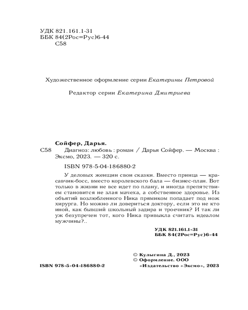 Серия: Cupcake. Счастливые истории Дарьи Сойфер У деловых женщин свои сказки. Вместо принца — красавчик-босс, вместо королевского бала — бизнес-план. Вот только в жизни не все идет по плану, и иногда препятствием становится не злая мачеха, а собственное здоровье. Из объятий возлюбленного Ника прямиком попадает под нож хирурга. Но можно ли довериться доктору, если это не кто иной, как бывший школьный задира и троечник? И так ли уж безупречен тот, кого Ника привыкла считать идеалом мужчины?.. |