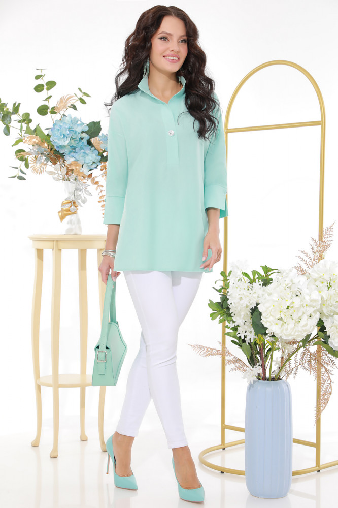 на фото нежно голубой, в реальности оказался почти как на форменных рубашках. Пуговицы очень удешевляют. Сидит хорошо, тонкая, но плотная. Хороший вариант повседневной/офисной блузки, если пуговицы перешить.