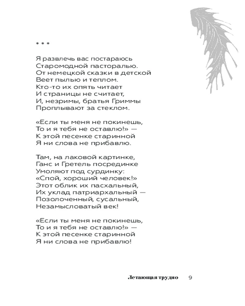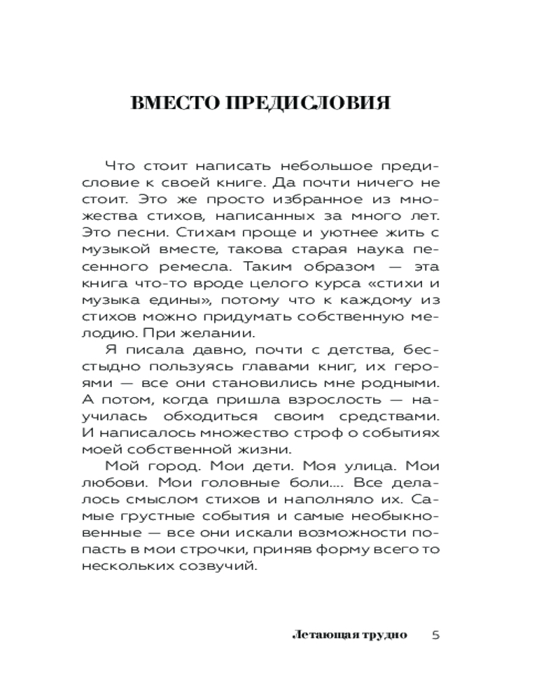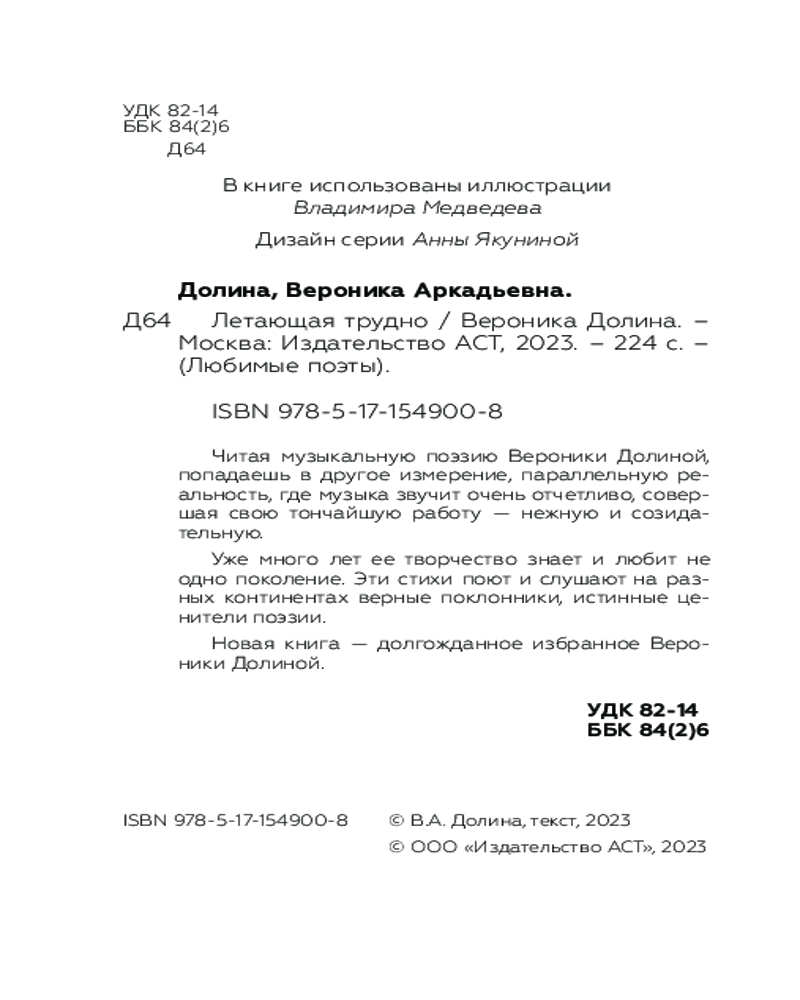Летающая трудноВ данный момент этот товар отсутствует в продаже. Возможно, у нас найдется аналогичный или похожий товар здесь. Серия: Любимые поэты Читая музыкальную поэзию Вероники Долиной, попадаешь в другое измерение, параллельную реальность, где музыка звучит очень отчетливо, совершая свою тончайшую работу — нежную и созидательную. Уже много лет ее творчество знает и любит не одно поколение. Эти стихи поют и слушают на разных континентах верные поклонники, истинные ценители поэзии. Новая книга — долгожданное избранное Вероники Долиной. |