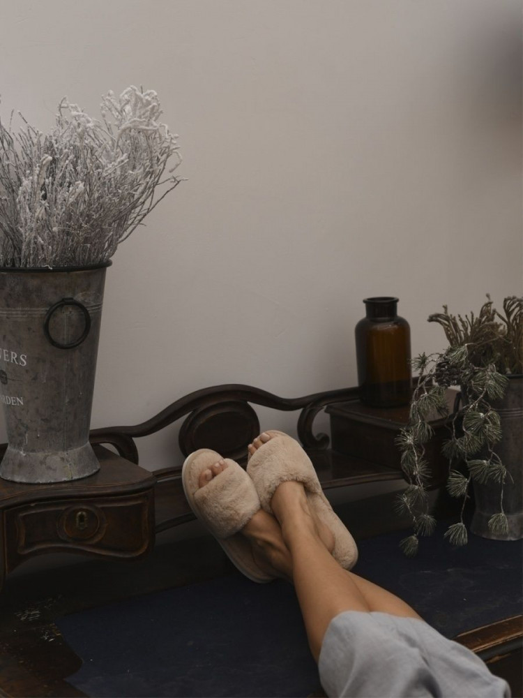 • сушка: встряхнуть тапочки, чтобы удалить с них остатки воды. Не выкручивать и не сжимать тапки. Можно обернуть их махровым полотенцем, чтобы вода быстрее впиталась. Нельзя раскладывать изделие на батарее или вывешивать на солнце. Мех из-за этого деформируется. Во время сушки ворс должен лежать ровно, без заломов, пушистой стороной вверх. Можно вывесить вещь на плечики, не используя прищепки. Нельзя сушить мех феном. Оптимальными условиями является сушка на свежем воздухе, но в тени, либо в теплом помещении с хорошей вентиляцией и низким уровнем влажности. Важный нюанс: у искусственного меха, в отличие от натурального, нет заданного направления ворса. Поэтому сразу после стирки его приглаживают ладонями в нужную сторону. Чтобы придать ворсу гладкость, используют кондиционер для белья. Когда мех высохнет, его нужно расчесать. Расческу используют с широким расстоянием между зубьями. Также можно воспользоваться массажной щеткой. Слишком сильно углублять расческу в ворс не нужно, чтобы не зацепить тканевую основу.