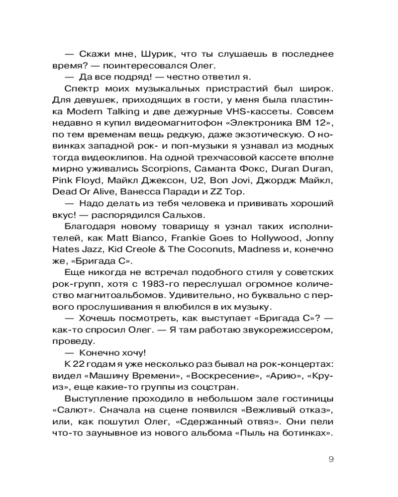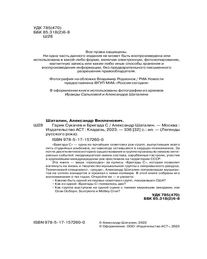 Серия: Легенды русского рока «Бригада С» — одна из ярчайших советских рок-групп, выпустивших всего пять студийных альбомов, но навсегда оставшаяся в сердцах поклонников. За почти десятилетнюю историю существования в группе произошло немало интересных событий: неоднократная смена состава, зарубежные гастроли, участие в крупнейшем международном рок-фестивале на территории СССР. Эта книга — ваша «проходка» за кулисы «Бригады С», которая позволит взглянуть на жизнь и творчество музыкальной группы с непривычного ракурса. Технический специалист, «роуди», Александр Шаталин сопровождал музыкантов на сотнях концертов и проехал с ними полмира. В этой книге собраны его воспоминания о тех годах. |