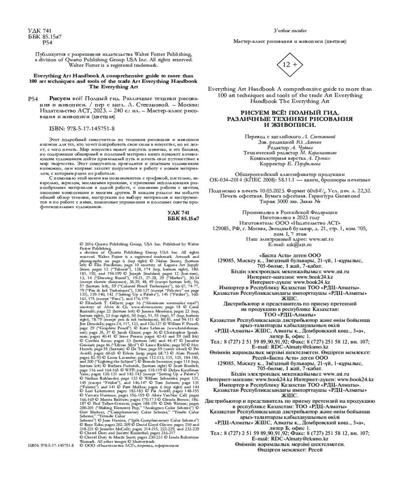 Серия: Мастер-класс рисования и живописи (цветная) Для некоторых людей искусство − это роскошь, которой можно наслаждаться, как изысканным украшением, или заниматься, сделав своим хобби. Другим искусство важно как средство самовыражения. Эта книга написана для тех, кто хочет попробовать свои силы в искусстве, но не знает, с чего начать. Мир искусства может напугать новичка, и эта базовая, но содержащая обширный и полезный материал книга поможет начинающим художникам найти правильный путь и начать свое путешествие в мир творчества. Эта книга пригодится и опытным художникам: возможно, они впервые захотят погрузиться в работу с новым материалом, с которым ранее не работали. |
