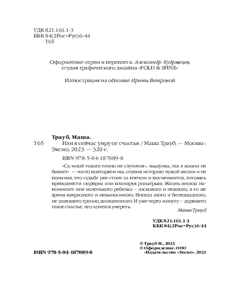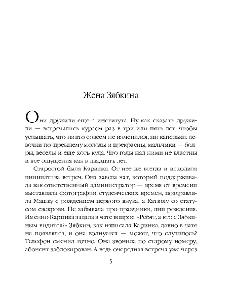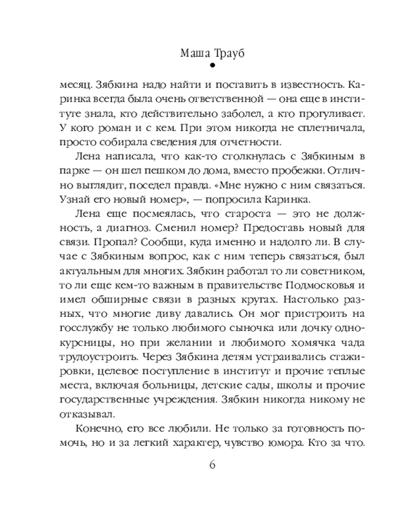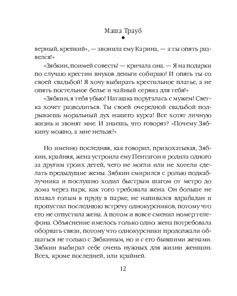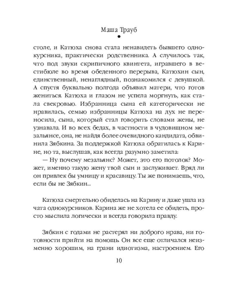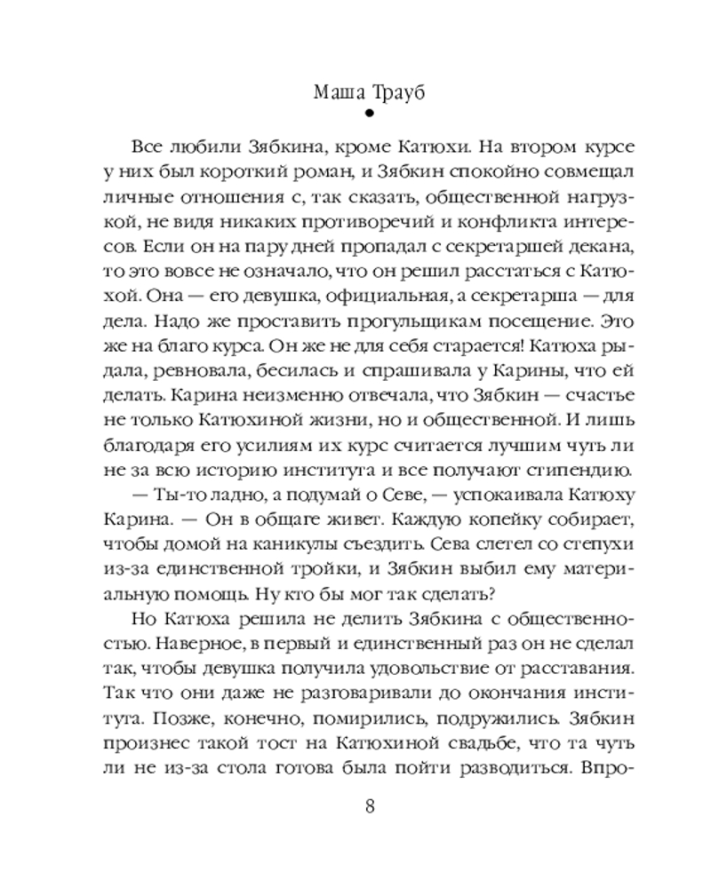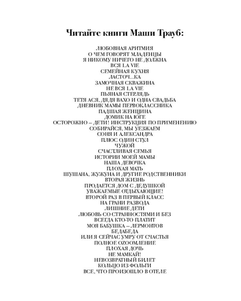 Серия: Проза Маши Трауб. Жизнь как в зеркале (обложка) В сборник вошли рассказы: «Жена Зябкина», «Галюсик», «Дверь», «Сумма слагаемых», «Или я сейчас умру от счастья». Это истории о людях, у которых нет ничего общего, кроме одного-единственного желания — быть любимыми. Каждый из них по мере сил решает эту непростую задачу — чувствовать себя нужным, занимающим важное место в жизни другого. И у каждого это получается по-своему. Персонажи Маши Трауб — не традиционные герои и не шаблонные злодеи. Это живые люди со своими радостями и утратами. И чем сложнее характер и нетривиальнее поступки, тем интереснее читать. |