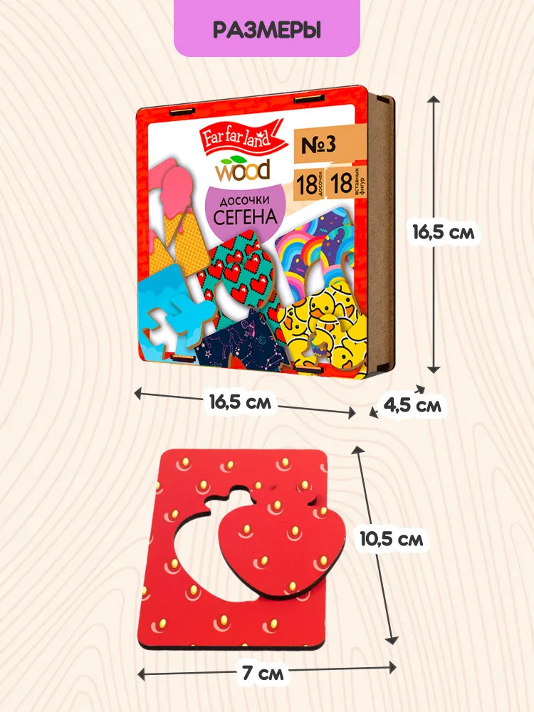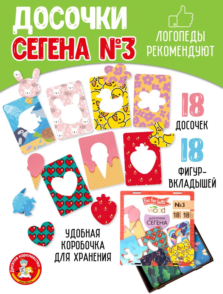 Игра «Досочки Сегена» № 3 — это развивающая игра для малышей, созданная по разработкам известного французского педагога и врача Эдуарда Сегена. Данная игра — усложненный вариант набора «Досочки Сегена» № 1 и № 2, так как в ней пазлы-вкладыши имеют не только разный цвет, но и более сложную форму.