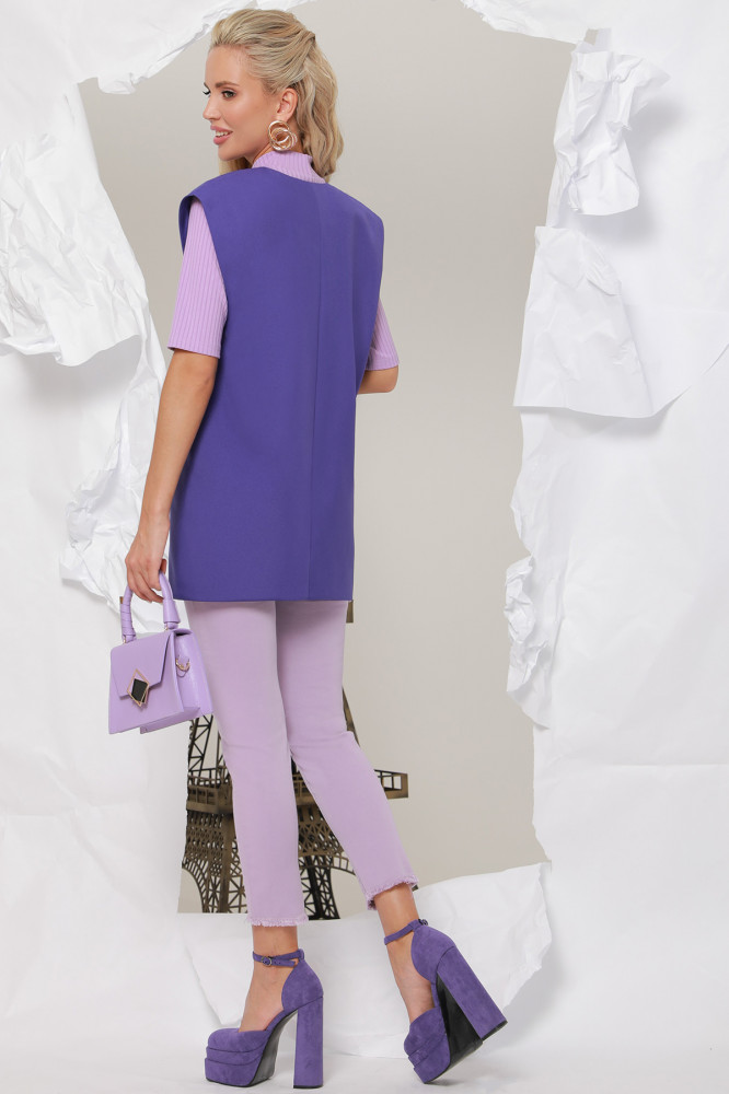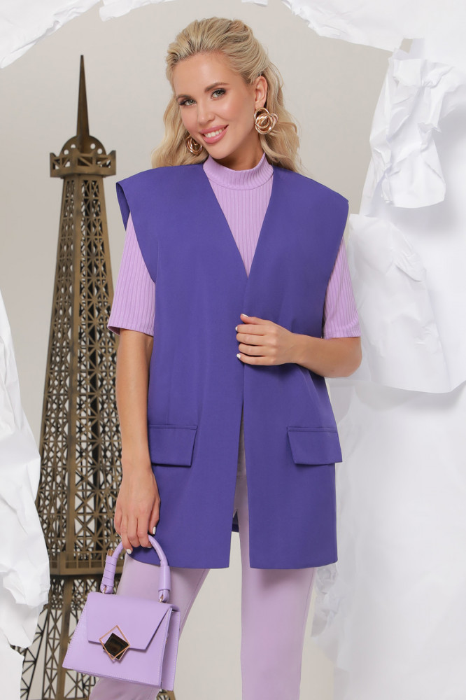 у жилета нет вытачек - совсем. Соответственно на груди всё топорщится. По сути это не жилет, а тряпочка на плечи. На спине тоже никаких вытачек. Ужасный крой. Плечи тоже несуразные. если у вас они узкие, то будет висеть как крылышки, а если широкие - с такой моделью плечи будут просто гигантскими.