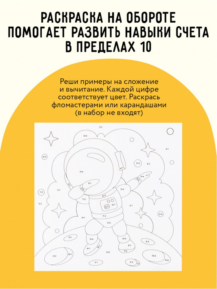 На оборотной стороне аппликации расположена раскраска по номерам. Решай примеры на сложение и вычитание. Каждой цифре соответствует цвет. Раскрась фломастерами или карандашами. Подобное хобби позволит провести досуг в семейном кругу не только приятно, но и с пользой!