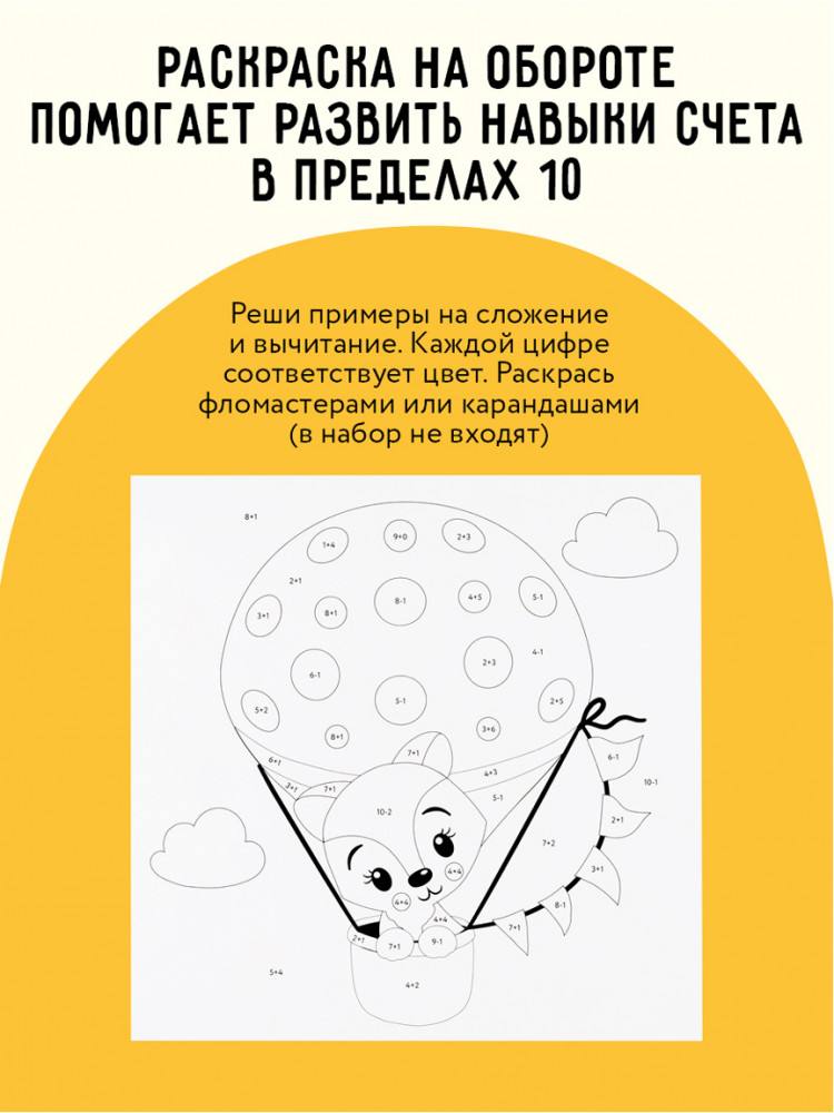 На оборотной стороне аппликации расположена раскраска по номерам. Решай примеры на сложение и вычитание. Каждой цифре соответствует цвет. Раскрась фломастерами или карандашами. Подобное хобби позволит провести досуг в семейном кругу не только приятно, но и с пользой!