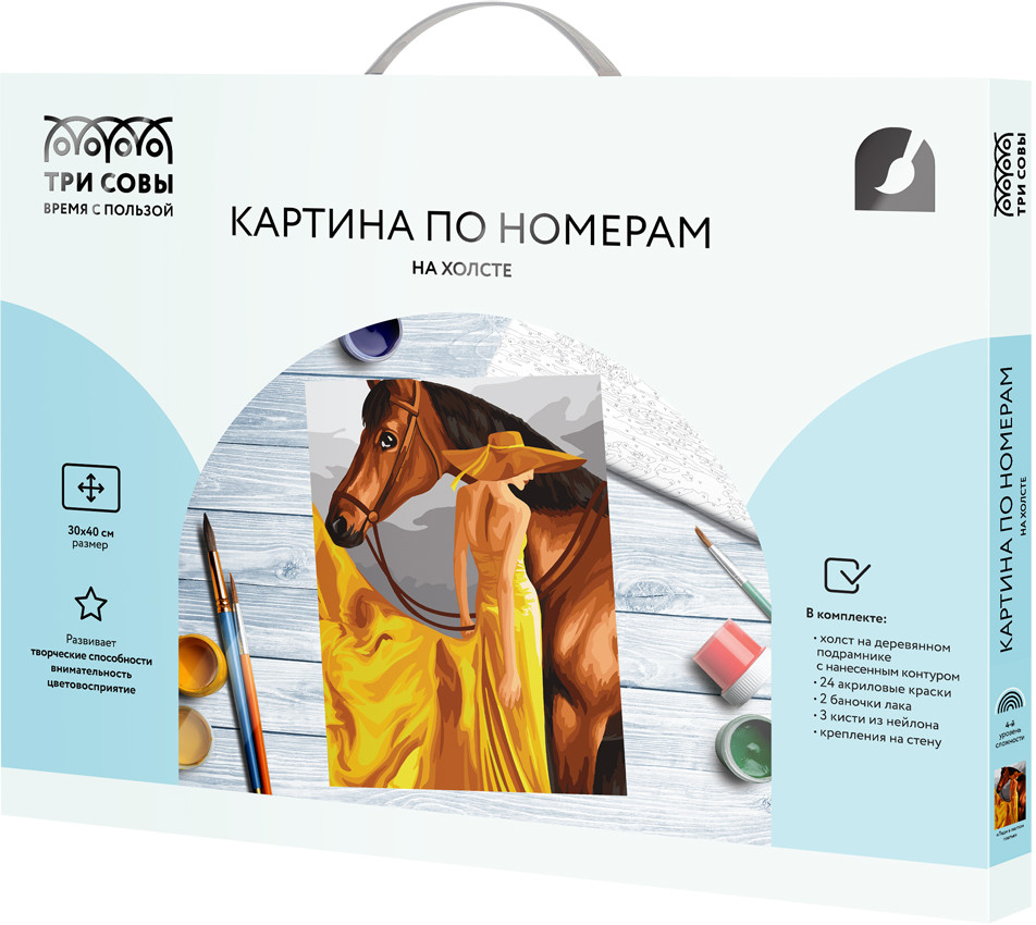 • холст на деревянном подрамнике 30×40 с нанесенным контуром, пронумерованный в соответствии с номерами красок. Контур под раскрашивание нанесен в том числе и на торцы подрамника, что позволяет разместить готовую работу на стене не обрамляя в багет или раму. Технология точной разбивки сюжета картины на разные цветовые оттенки гарантируют правильность исполнения полотна;