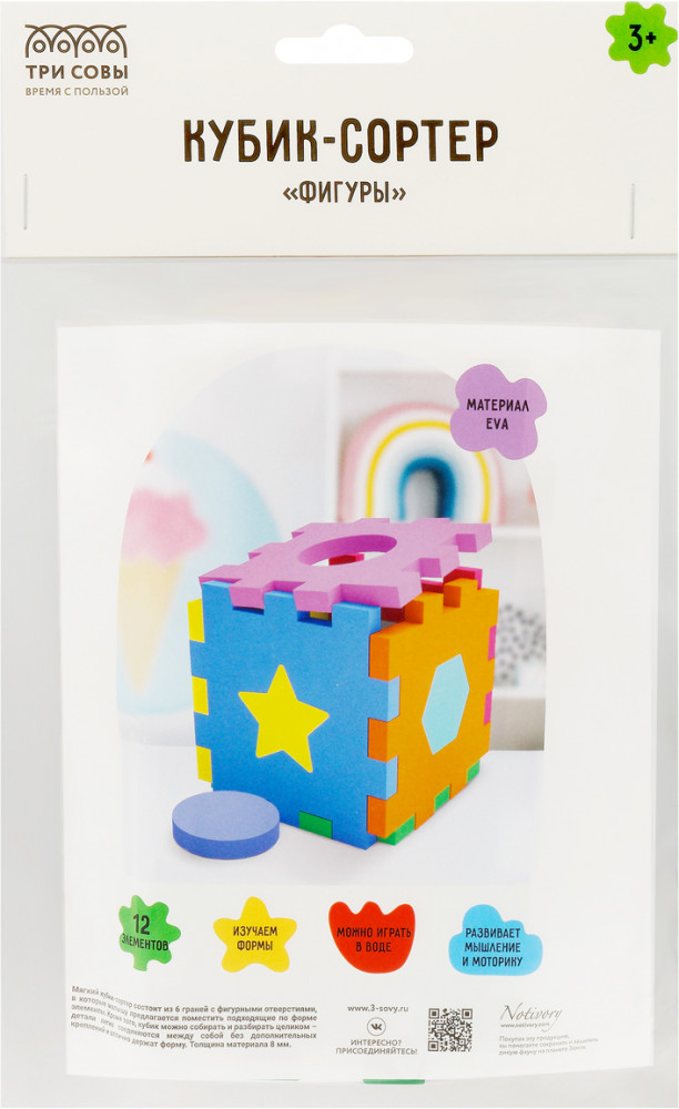 Три совы Игрушка развивающая «Фигуры»В данный момент этот товар отсутствует в продаже. Возможно, у нас найдется аналогичный или похожий товар здесь. Мягкий кубик-сортер состоит из 6 граней с фигурными отверстиями, в которые малышу предлагается поместить подходящие по форме элементы. Кроме того, кубик можно собирать и разбирать целиком — детали легко соединяются между собой без дополнительных креплений и отлично держат форму. Толщина материала 8 мм |