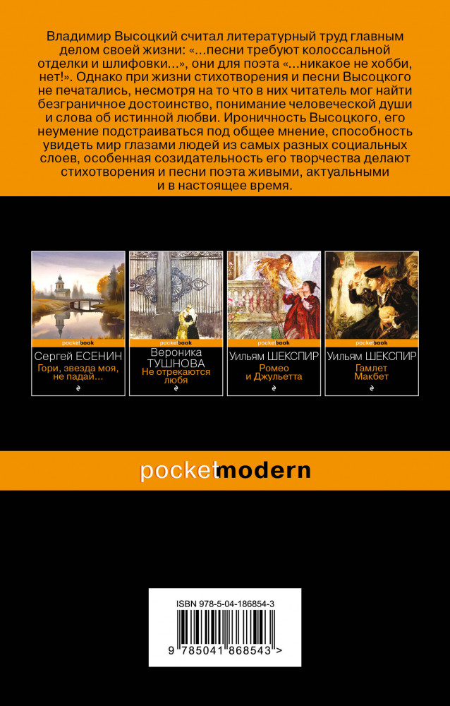 В данный момент этот товар отсутствует в продаже. Возможно, у нас найдется аналогичный или похожий товар здесь. Серия: Pocket book (обложка). Русская классика Владимир Высоцкий считал литературный труд главным делом своей жизни: «... песни требуют колоссальной отделки и шлифовки...», они для поэта — «... никакое не хобби, нет!». Однако при жизни стихотворения и песни Высоцкого не печатались, несмотря на то, что в них читатель мог найти безграничное достоинство, понимание человеческой души и слова об истинной любви. Ироничность Высоцкого, его неумение подстраиваться под общее мнение, способность увидеть мир глазами людей из самых разных социальных слоев, особенная созидательность его творчества делают стихотворения и песни поэта живыми, актуальными и в настоящее время. |