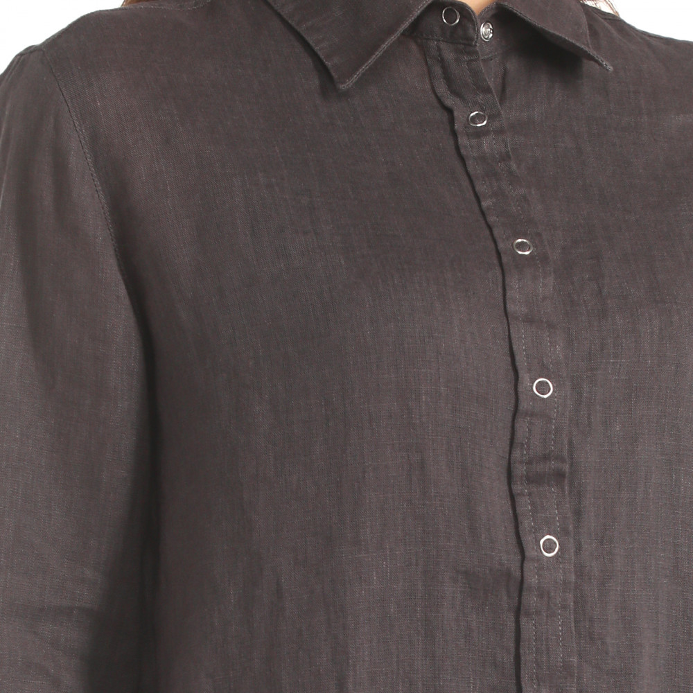 Хорошая приятная к телу рубашка, лен хорошего качества, нежный цвет (голубой), брала на размер больше, после стирки сел немного, как раз как надо, надеюсь, что больше не сядет... Удобно как второй слой на выпуск с топом или футболкой.. Единственное, мне не очень понравились кнопки, вроде не портят в целом рубашку.