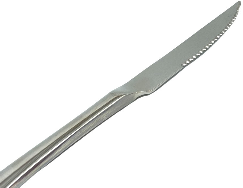 Нож для стейка имеет классическую форму. Нож в сочетании с другими столовыми приборами великолепно подойдут к фарфоровым и бамбуковым изделиям и дополнят сервировку Вашего стола. Стальной нож для стейков универсально подойдёт к любому сервировочному блюду или обеденной тарелке.