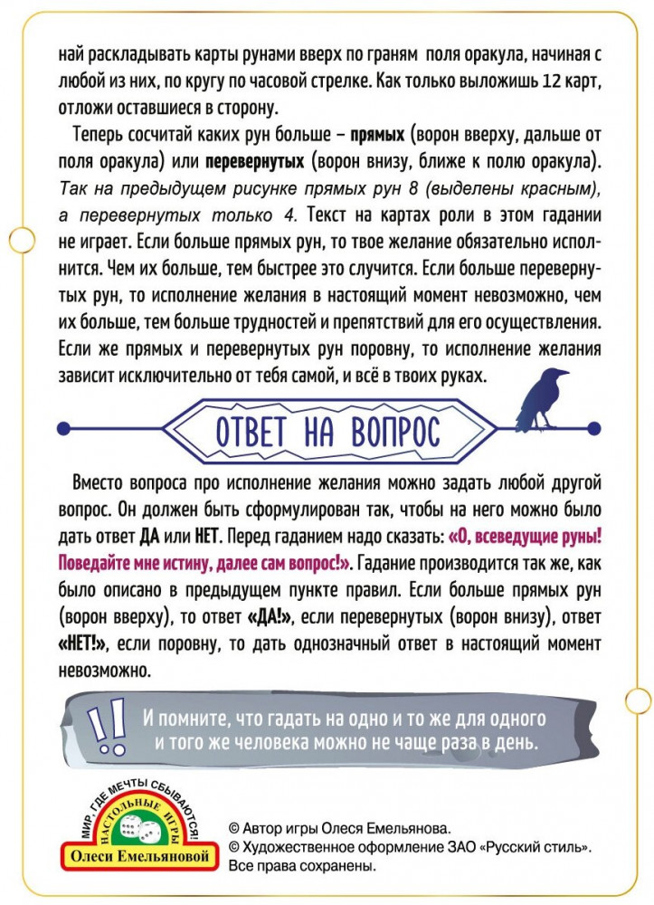 Русский стиль Игра «Магические руны»В данный момент этот товар отсутствует в продаже. Возможно, у нас найдется аналогичный или похожий товар здесь. Серия: Девичьи гадания Игра настольная Девичьи гадания «Магические руны» – это увлекательное занятие для девочек. Гадание поможет создать магическую атмосферу, заглянуть в будущее, и получить ответы на свои вопросы... |