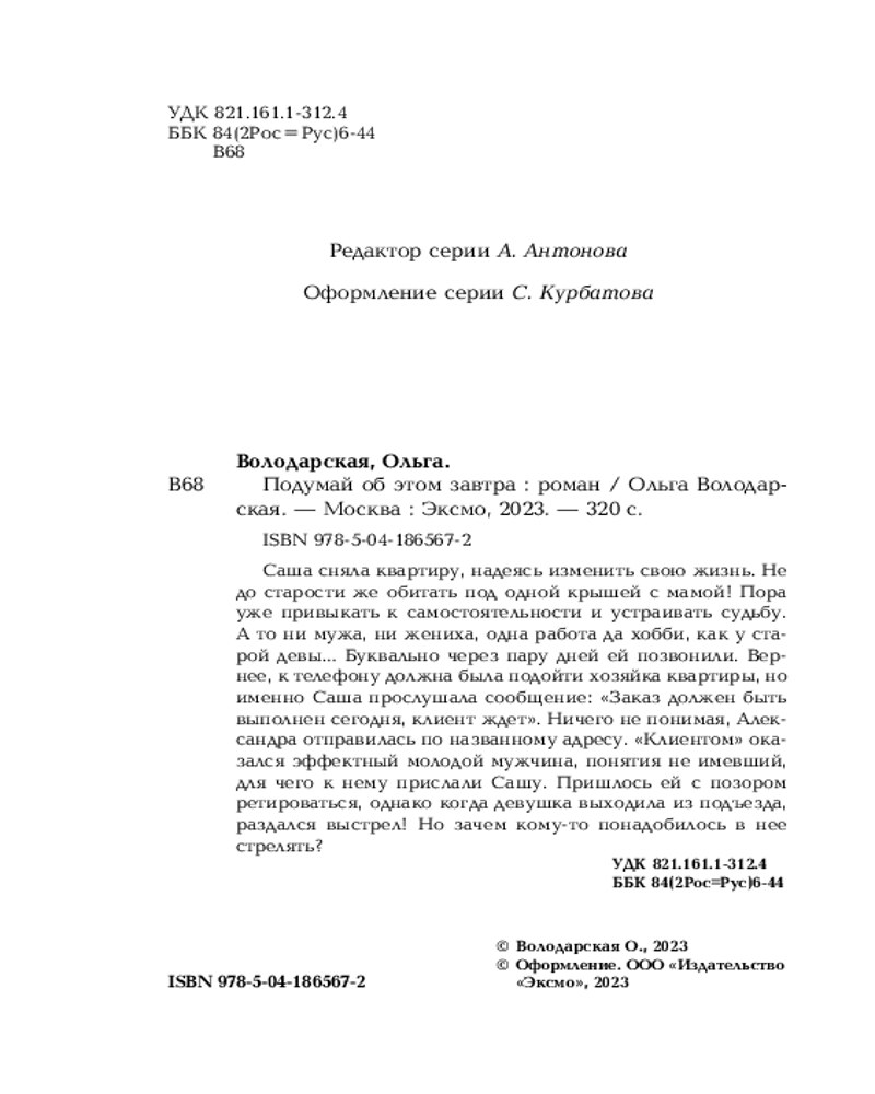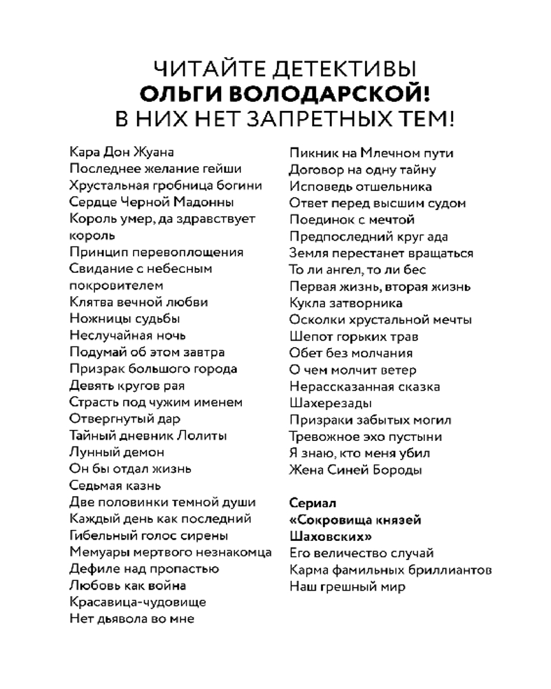 Серия: Никаких запретных тем! Остросюжетная проза О. Володарской. Новое оформление (обложка) Саша сняла квартиру, надеясь изменить свою жизнь. Не до старости же обитать под одной крышей с мамой! Пора уже привыкать к самостоятельности и устраивать судьбу. А то ни мужа, ни жениха, одна работа да хобби, как у старой девы... Буквально через пару дней ей позвонили. Вернее, к телефону должна была подойти хозяйка квартиры, но именно Саша прослушала сообщение: «Заказ должен быть выполнен сегодня, клиент ждет». Ничего не понимая, Александра отправилась по названному адресу. «Клиентом» оказался эффектный молодой мужчина, понятия не имевший, для чего к нему прислали Сашу. Пришлось ей с позором ретироваться, однако когда девушка выходила из подъезда, раздался выстрел! Но зачем кому-то понадобилось в нее стрелять? |