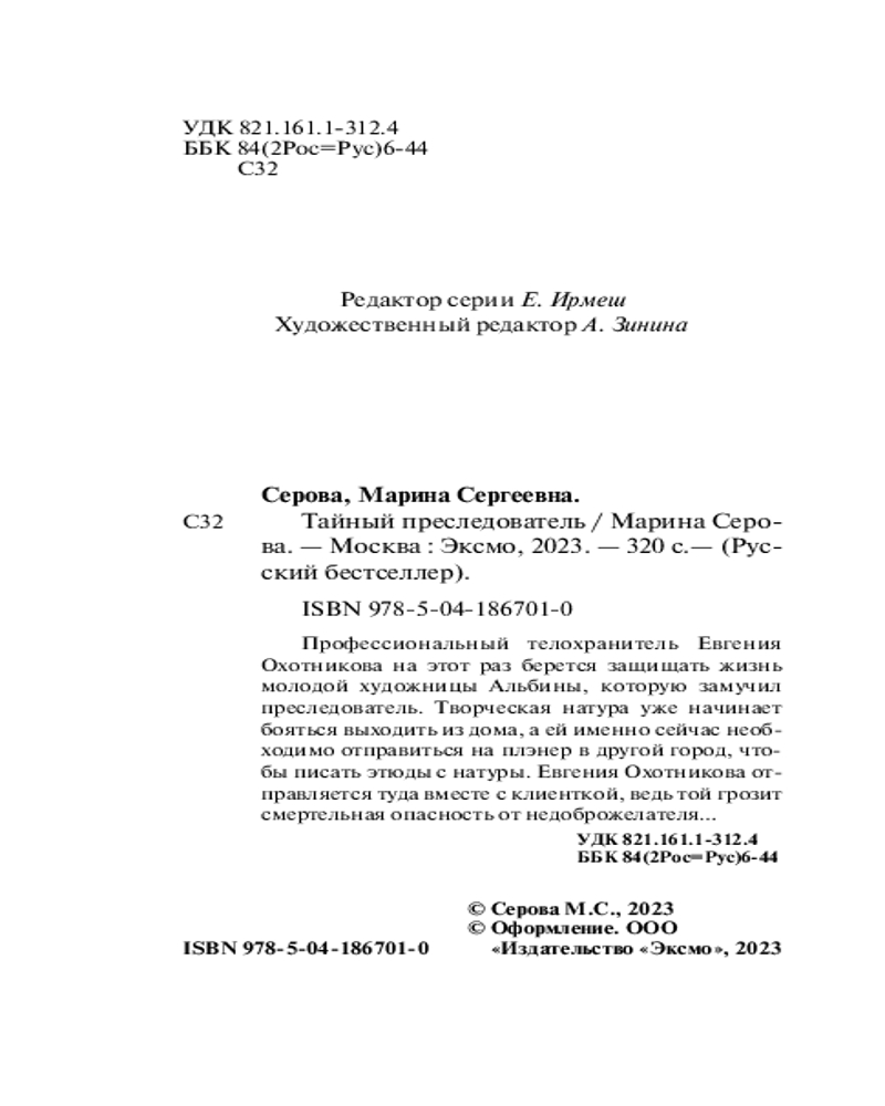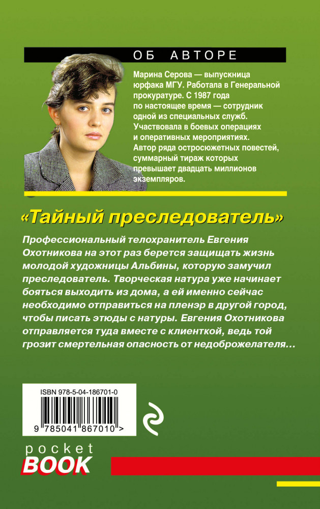 | Марина Сергеевна Серова — один из ведущих авторов серии современного русского детективного жанра (существует версия, что это коллектив авторов под общим руководством литературного агента Сергея Потапова). Согласно легенде, «выпускница юридического факультета МГУ, работала в Генеральной прокуратуре, сотрудница одной из спецслужб, участвовала в боевых операциях». Между тем написала 425 произведений размером порядка 200 страниц (и число их постоянно увеличивается). Часть произведений... |