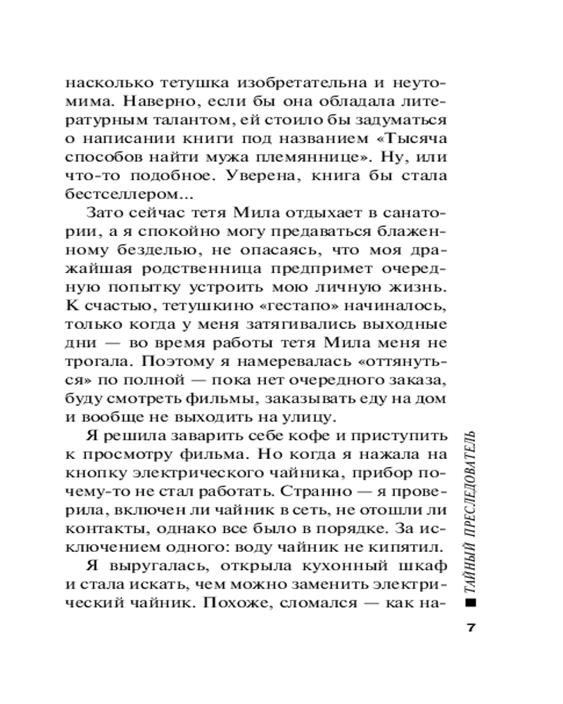 Тайный преследовательВ данный момент этот товар отсутствует в продаже. Возможно, у нас найдется аналогичный или похожий товар здесь. Серия: Русский бестселлер (обложка) Профессиональный телохранитель Евгения Охотникова на этот раз берется защищать жизнь молодой художницы Альбины, которую замучил преследователь. Творческая натура уже начинает бояться выходить из дома, а ей именно сейчас необходимо отправиться на плэнер в другой город, чтобы писать этюды с натуры. Евгения Охотникова отправляется туда вместе с клиенткой, ведь той грозит смертельная опасность от недоброжелателя... |