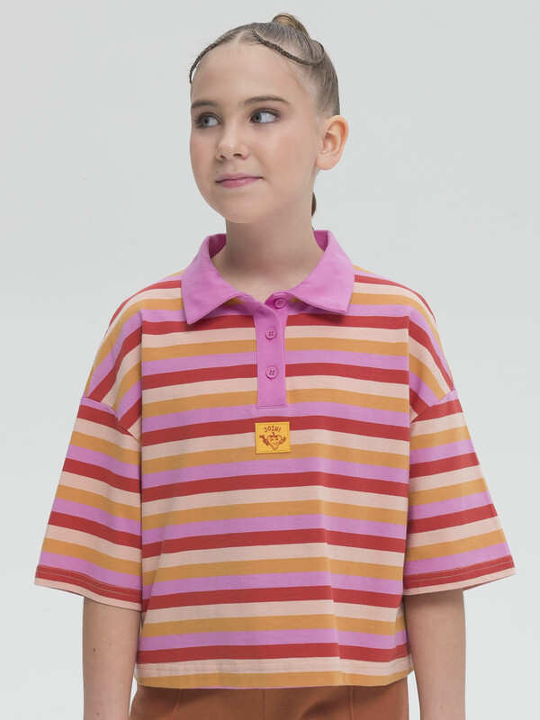 Кроп-топ (поло) оверсайз-силуэта для девочки. Кроп-топ — один из актуальных летних трендов. Модель со спущенным плечом и удлинённым рукавом выполнена из трикотажного полотна в яркую вытканную горизонтальную полоску. Это не принт, полоски не поблёкнут от многочисленных стирок. Состав ткани — хлопок 100%. Благодаря этому поло мягкое, комфортное и приятное на ощупь. Практичный оверсайз-силуэт позволит носить топ продолжительное время. Даже если ребёнок заметно подрастёт, он не станет малым. Модель украшена симпатичной и приятной на ощупь резиновой нашивкой под планкой с пуговицами. Кроп-поло отлично сочетается с шортами и леггинсами.