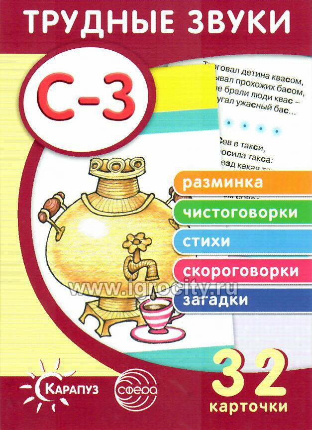 Серия: Комплекты карточек для индивидуальных занятий Данный материал, рассчитанный на курс из 24 занятий, поможет ребёнку закрепить неустойчивые звуки С-3. Проводить их следует ежедневно по 10-15 минут, делая перерывы на выходные (в течение 3-4 недель). Методика проведения описана на последней карточке.