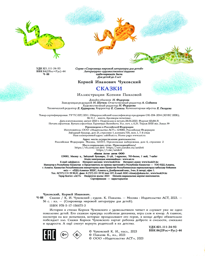 Серия: Сокровища мировой литературы для детей Сказки Корнея Чуковского, написанные в начале прошлого века, и сегодня остаются любимыми у многих читателей — и детей, и взрослых. Это весёлые и добрые истории о животных и их удивительных приключениях, которые, несмотря на свою простоту и лёгкость, учат нас быть смелыми, находчивыми, ценить дружбу и всегда приходить на помощь тем, кто попал в беду. |