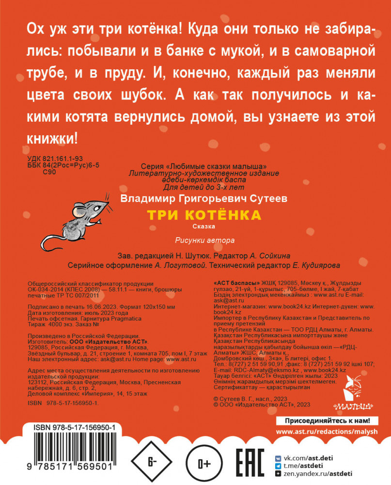 Серия: Любимые сказки малыша Ох уж эти три котёнка! Куда они только не забирались: побывали и в банке с мукой, и в самоварной трубе, и в пруду. И, конечно, каждый раз меняли цвета своих шубок. А как так получилось и какими котята вернулись домой, вы узнаете из этой книжки! |