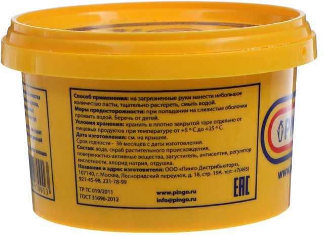 Нейтральное средство для эффективной очистки и удаления масла, смазок, типографской краски, графита, плиточного клея, битума, сажи, антикоррозийных материалов, производственной пыли, грязи и других загрязнений с кожи руки. Обладает антисептическим действием, не сушит кожу рук и не вызывает аллергических реакций. Значительно экономичней мыла и других моющих средств. Применяется на производстве, в автомастерских, быту и домашнем хозяйстве. Производится по эксклюзивной рецептуре. |