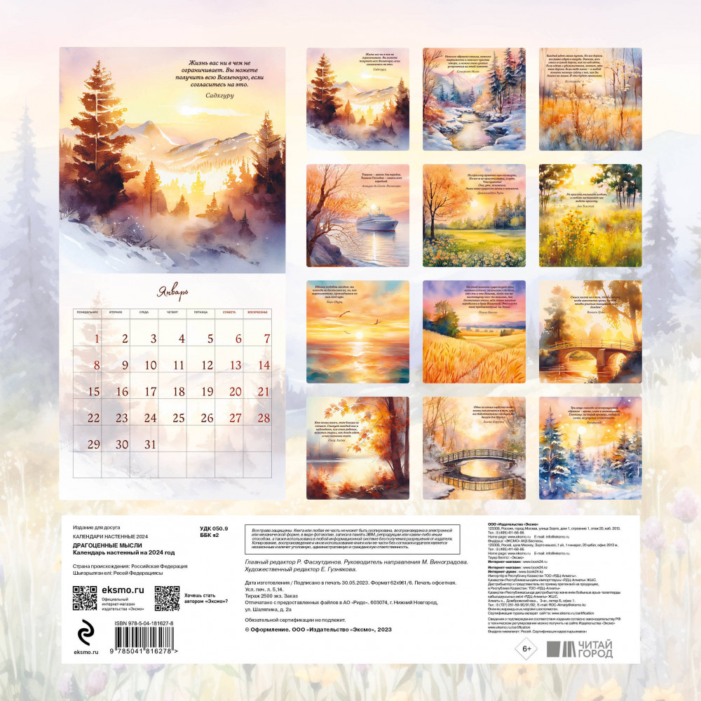 Календарь настенный на 2024 год «Драгоценные мысли»В данный момент этот товар отсутствует в продаже. Возможно, у нас найдется аналогичный или похожий товар здесь. Серия: Календари настенные 2024 (300×300) В календаре процитированы Омар Хайям, Льюис Кэрролл, Лев Толстой и многие другие гении мысли всего мира. Календарь станет отличным подарком для ценителей живописных иллюстраций и для тех, кто хочет получить жизнеутверждающий совет от великих людей. Этот календарь — вдохновляющий подарок на Новый год или День рождения. |