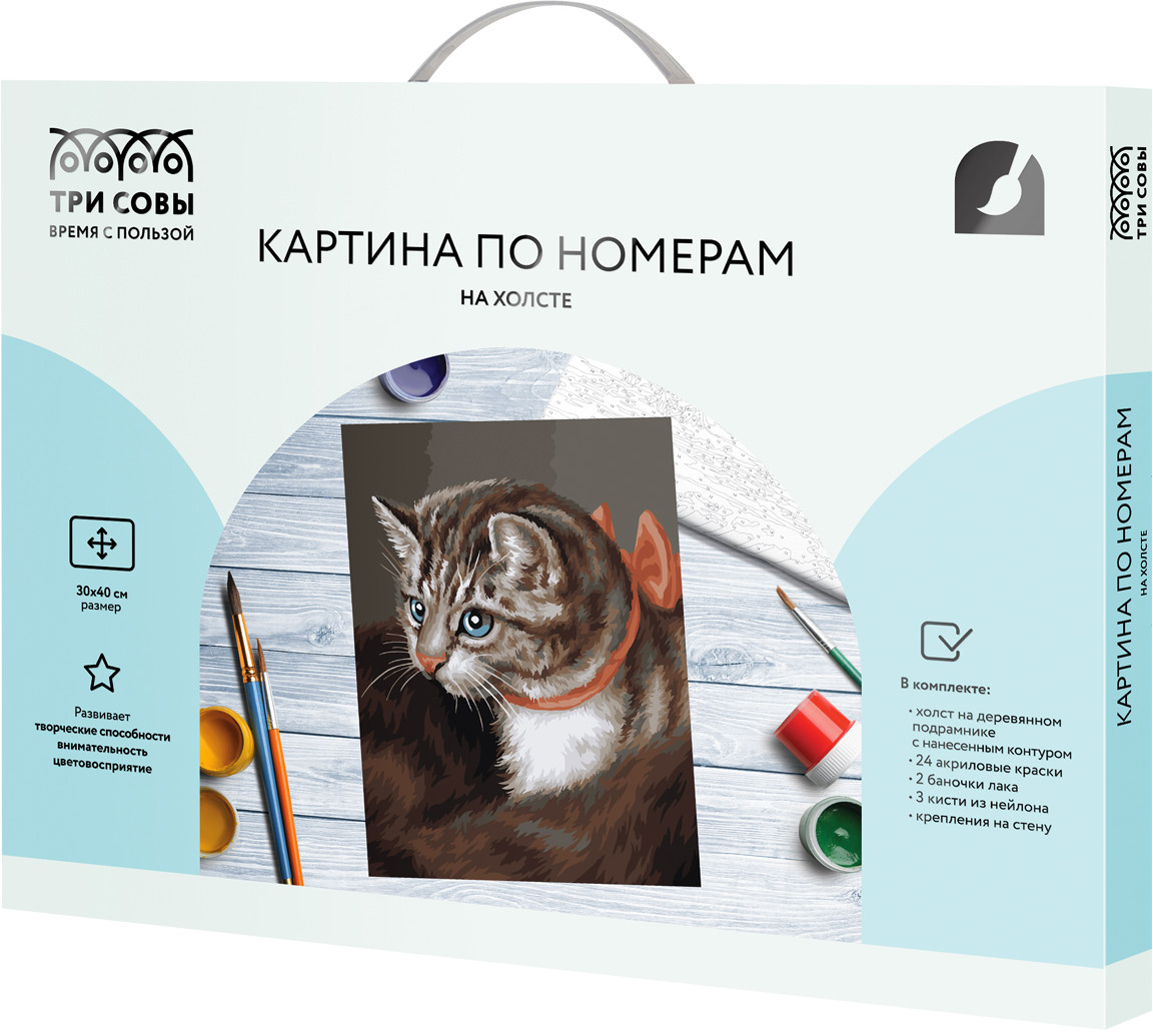 • холст на деревянном подрамнике 30×40 см с нанесенным контуром, пронумерованный в соответствии с номерами красок. Контур под раскрашивание нанесен в том числе и на торцы подрамника, что позволяет разместить готовую работу на стене не обрамляя в багет или раму. Технология точной разбивки сюжета картины на разные цветовые оттенки гарантируют правильность исполнения полотна;