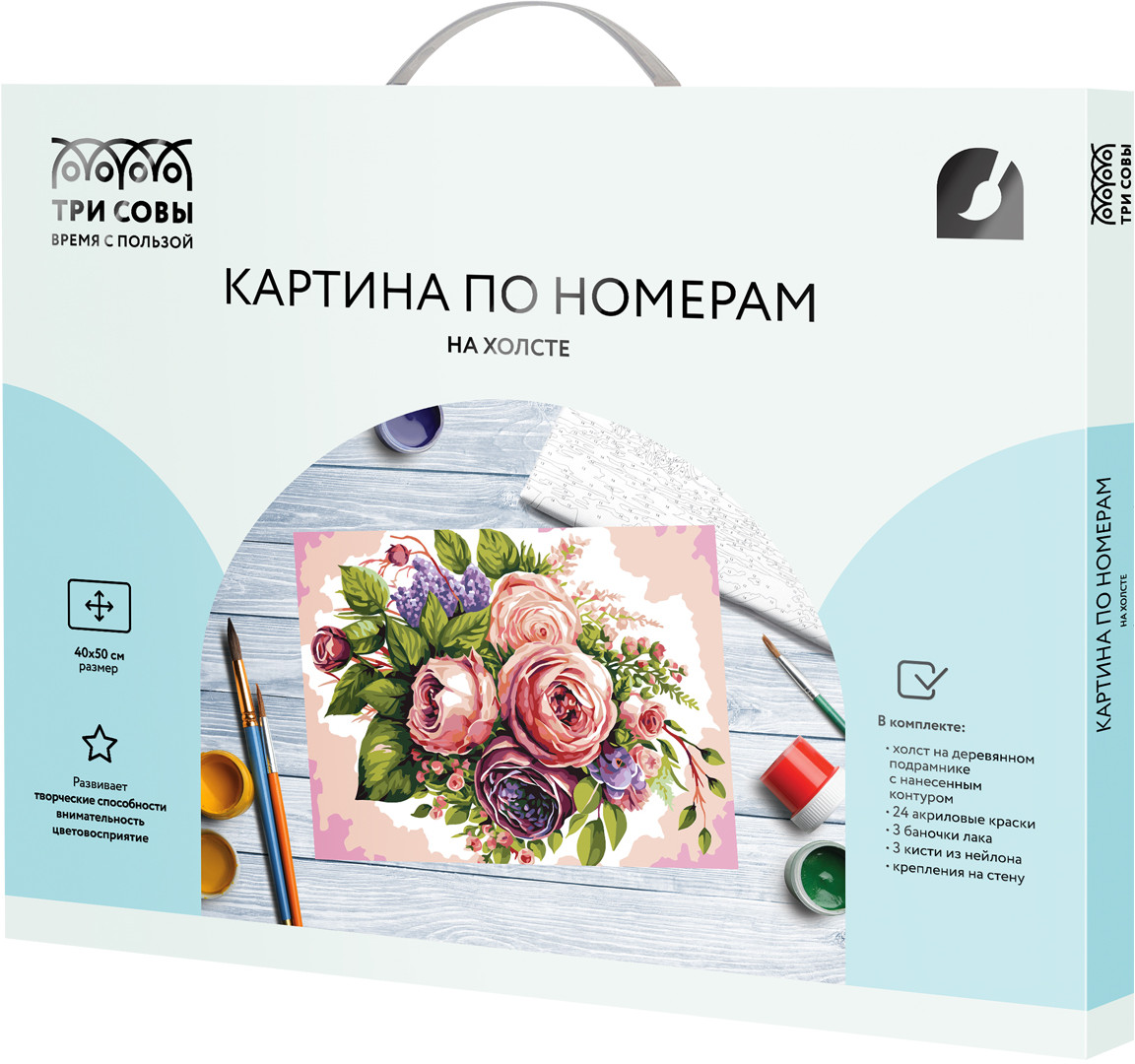 • холст на деревянном подрамнике 40×50 с нанесенным контуром, пронумерованный в соответствии с номерами красок. Контур под раскрашивание нанесен в том числе и на торцы подрамника, что позволяет разместить готовую работу на стене не обрамляя в багет или раму. Технология точной разбивки сюжета картины на разные цветовые оттенки гарантируют правильность исполнения полотна;