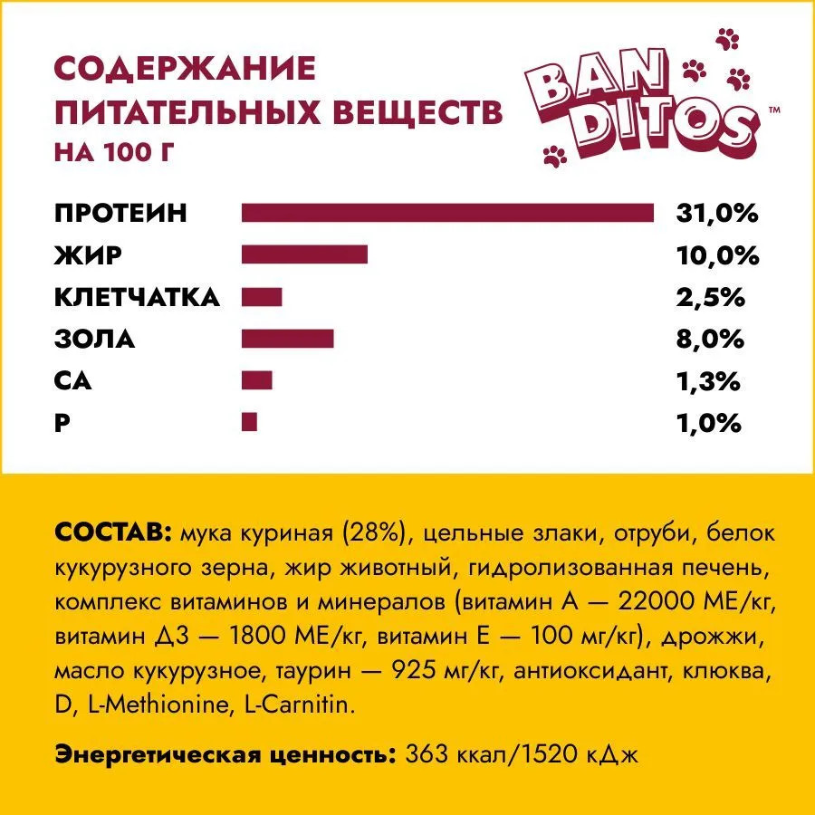Banditos Корм для стерилизованных кошек склонных к ожирению с курицейВ данный момент этот товар отсутствует в продаже. Возможно, у нас найдется аналогичный или похожий товар здесь. Условия хранения товара: температурный режим от -10 до +25°С. |