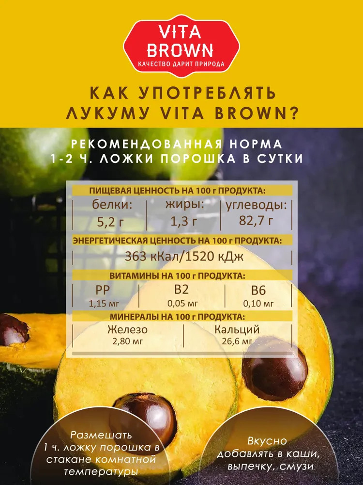 Vita Brown Лукума сушенаяВ данный момент этот товар отсутствует в продаже. Возможно, у нас найдется аналогичный или похожий товар здесь. Лукума — сладкий плод субтропического дерева, произрастающего на территории Андских долин, в Боливии, Чили и на Гавайях. Впервые этот сладкий фрукт начали выращивать в 200 годах до нашей эры. Жители Южной Америки обожали его и изображали дерево на керамике и глине, использовали в кулинарных и лечебных целях. Благодаря тропической сладости плодов порошок может быть использован в качестве природного заменителя сахара. |