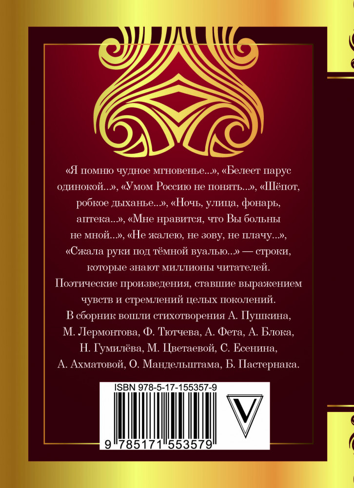 Серия: Великая поэзия «Я помню чудное мгновенье...», «Белеет парус одинокой...», «Умом Россию не понять...», «Шепот, робкое дыханье...», «Ночь, улица, фонарь, аптека...», «Мне нравится, что Вы больны не мной...», «Не жалею, не зову, не плачу...», «Сжала руки под темной вуалью...» — строки, которые знают миллионы читателей. Поэтические произведения, ставшие выражением чувств и стремлений целых поколений. В сборник вошли стихотворения А. Пушкина, М. Лермонтова, Ф. Тютчева, А. Фета, А. Блока, Н. Гумилёва, М. Цветаевой, С. Есенина, А. Ахматовой, О. Мандельштама, Б. Пастернака. |