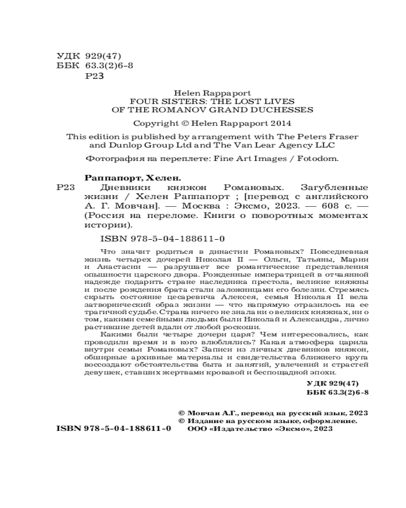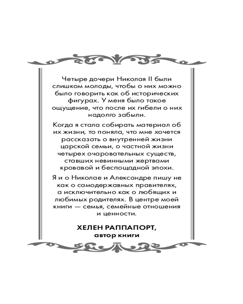 Серия: Россия на переломе. Книги о поворотных моментах истории Международный бестселлер историка Хелен Раппапорт — уникальная биография о частной жизни дочерей последнего русского императора. Что значит родиться в династии Романовых? Повседневная жизнь четырех дочерей Николая II разрушает все романтические представления о пышности царского двора. Рожденные императрицей в отчаянной надежде подарить стране наследника престола, великие княжны и после рождения брата стали заложницами его болезни. Стремясь скрыть состояние цесаревича Алексея, семья Николая II вела затворнический образ жизни — что напрямую отразилось на ее трагичной судьбе. Страна ничего не знала ни о великих княжнах, ни о том, какими семейными людьми были Николай и Александра, лично растившие детей вдали от любой роскоши. |