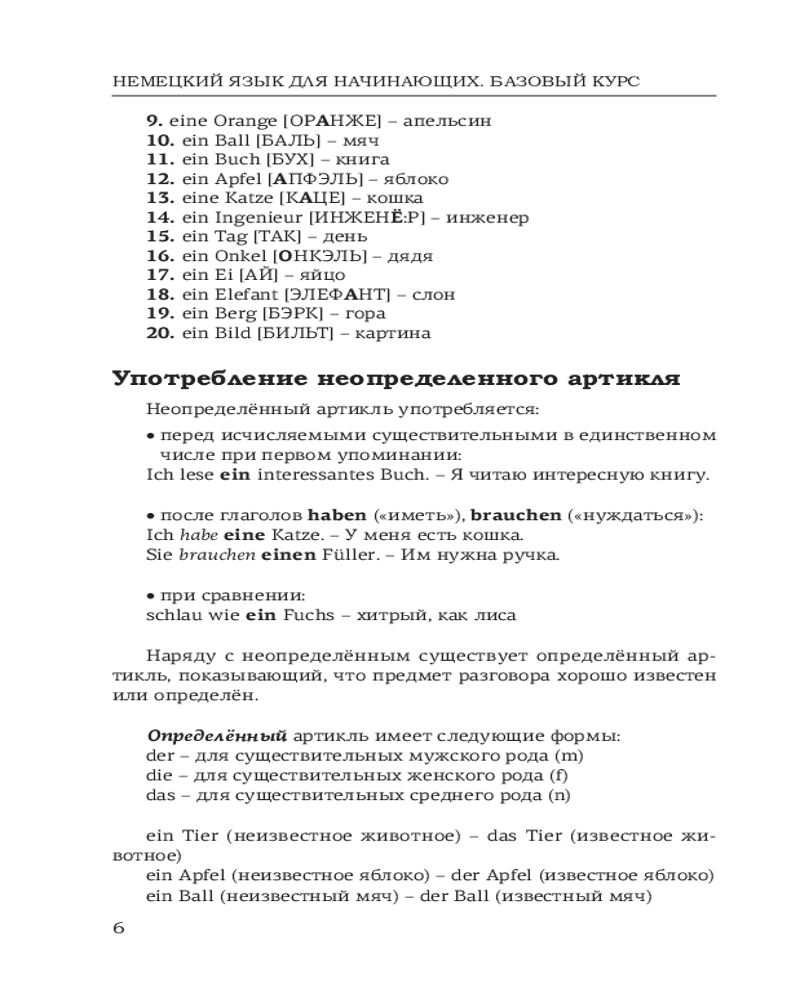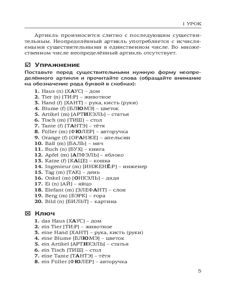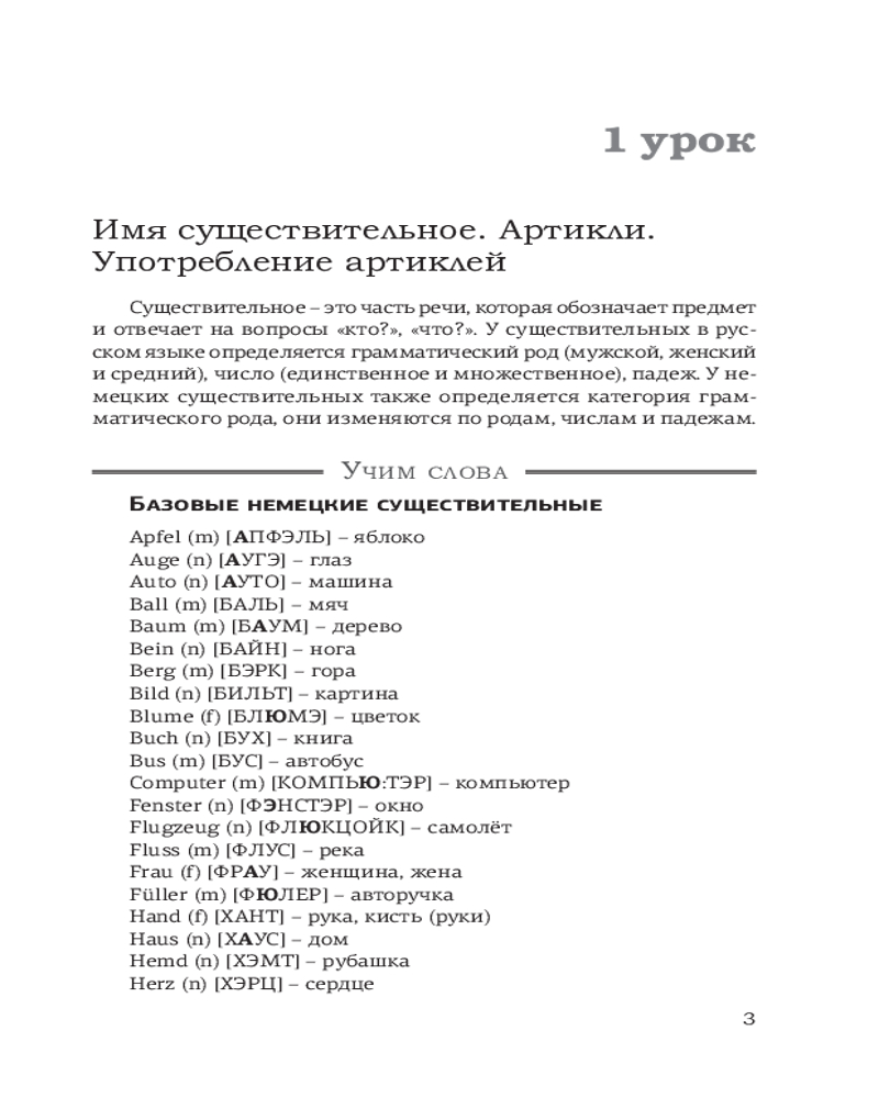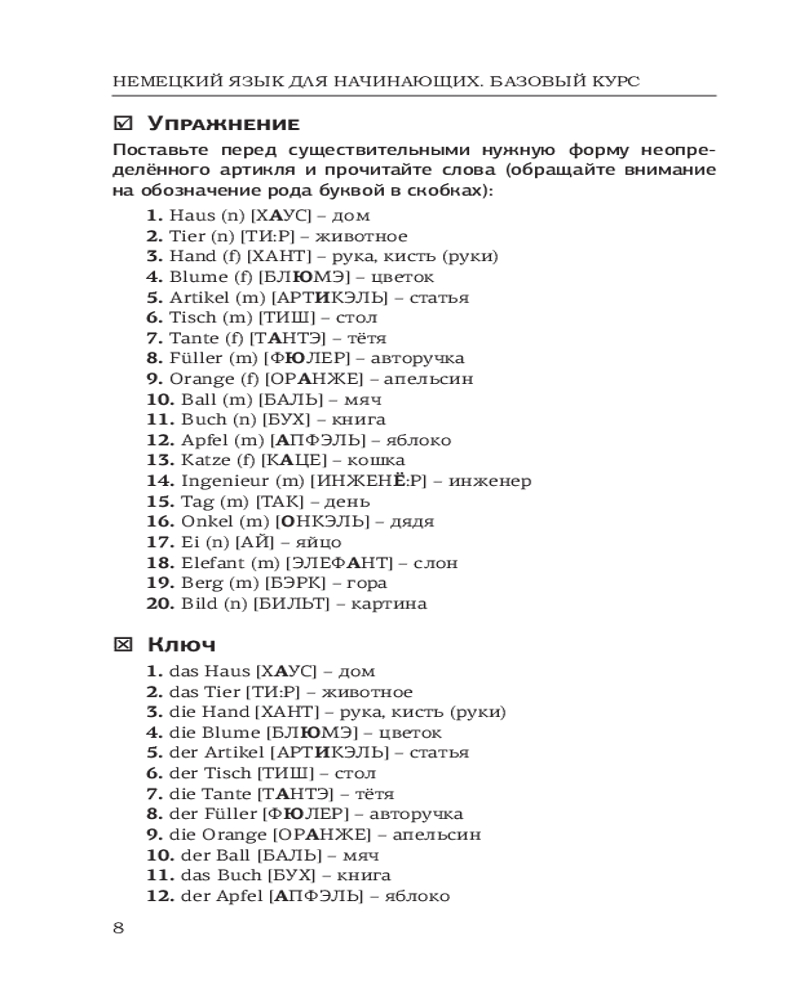 Данное издание содержит базовый материал по лексике и грамматике немецкого языка для начинающих (уровни А1-А2). К каждому уроку приводятся самые употребительные немецкие слова, а также упражнения. Ключи к упражнениям удобно расположены рядом, поэтому не нужно постоянно заглядывать в конец книги.