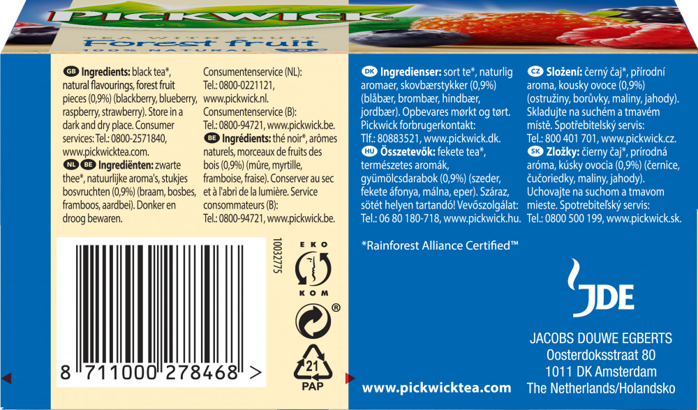 Pickwick Чай чёрный «Forest Fruit»В данный момент этот товар отсутствует в продаже. Возможно, у нас найдется аналогичный или похожий товар здесь. Чай имеет вкус настоящих ягод. Кусочки настоящей ежевики, малины, клубники и черники, добавленные в чайную смесь, позволяют получить вкусный, освежающий чай с ароматом лесных ягод. Наслаждайтесь чашечкой пиквикских лесных фруктов в любое время дня. |