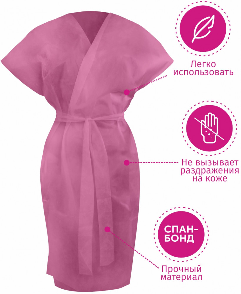 Одноразовые медицинские халаты без рукавов из спанбонда обеспечивают индивидуальную гигиену и комфорт, подходят для использования в косметологии, спа-салонах, парикмахерских, косметологических и медицинских центрах, гостиницах, банях и саунах. Большой выбор цветов — можно подобрать под цветовую гамму салона. Халат защитит клиента от попадания жидкостей и препаратов во время процедур. Благодаря универсальному размеру они подходят и для мужчин, и для женщин. Изделия изготовлены из современных безворсовых материалов — спанбонда. Материал не растягивается и не рвется, не вызывает аллергии, защищает от бактерий. Не электризует волосы и пыль, не доставляя неприятных ощущений клиенту. Каждый раз используется новый одноразовый халат. После применения изделие выбрасывают.
