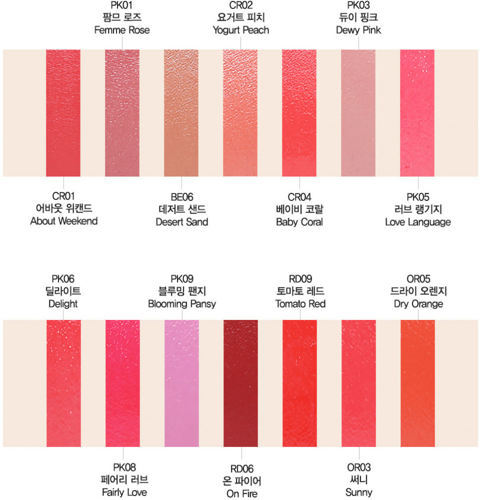 PK05 Love LanguageOR05 Dry OrangeCR04 Baby CoralPK09 Blooming PansyCR02 Yogurt PeachPK03 Dewy PinkBE06 Desert Sand