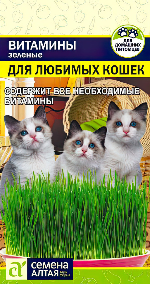 Зеленые витамины для любимых кошек – полезная добавка к рациону любимых питомцев. Свежая зелень содержит огромное количество витаминов, макро- и микроэлементов, клетчатки и других веществ, необходимых кошке для здоровья и долголетия. Особенности растения: зелёные витамины – это смесь семян злаковых трав, из которой выращивается сочная и полезная зелень. Она содержит витамины, минеральные элементы и другие нутриенты, необходимые организму кошки для активности и долголетия. Витамины для кошек укрепляют иммунитет питомца, улучшают работу пищеварительной системы, придавая шерсти мягкость и блеск. Условия выращивания: посев семян можно проводить круглогодично. Семена углубляют в легкую и плодородную почву на 4-5 мм, далее опрыскивают из пульверизатора и накрывают стеклом или полиэтиленовой пленкой. Рассадную ёмкость оставляют в тёплом месте. Первая зелень созревает через 8-11 дней. Её дают кошке в мелко порезанном виде или позволяют животному самому отщипывать с кустиков. Также витамины для кошек можно высаживать в открытом грунте, высеивая их в мае или июне.