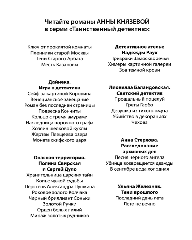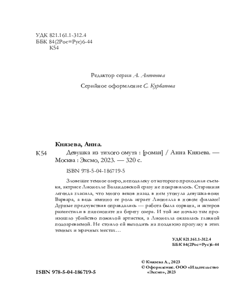 Серия: Таинственный детектив Анны Князевой. Новое оформление (обложка) Зловещее темное озеро, неподалеку от которого проходили съемки, актрисе Лионелле Баландовской сразу не понравилось. Старинная легенда гласила, что много веков назад в нем утонула девушка-воин Варвара, а ведь именно ее роль играет Лионелла в новом фильме! Дурные предчувствия оправдались — работа была сорвана, и актеров разместили в пансионате на берегу озера. И той же ночью там произошло убийство пожилой артистки, а Лионелла оказалась главной подозреваемой. Не стоило ей выходить на позднюю прогулку в этих темных и мрачных местах... |